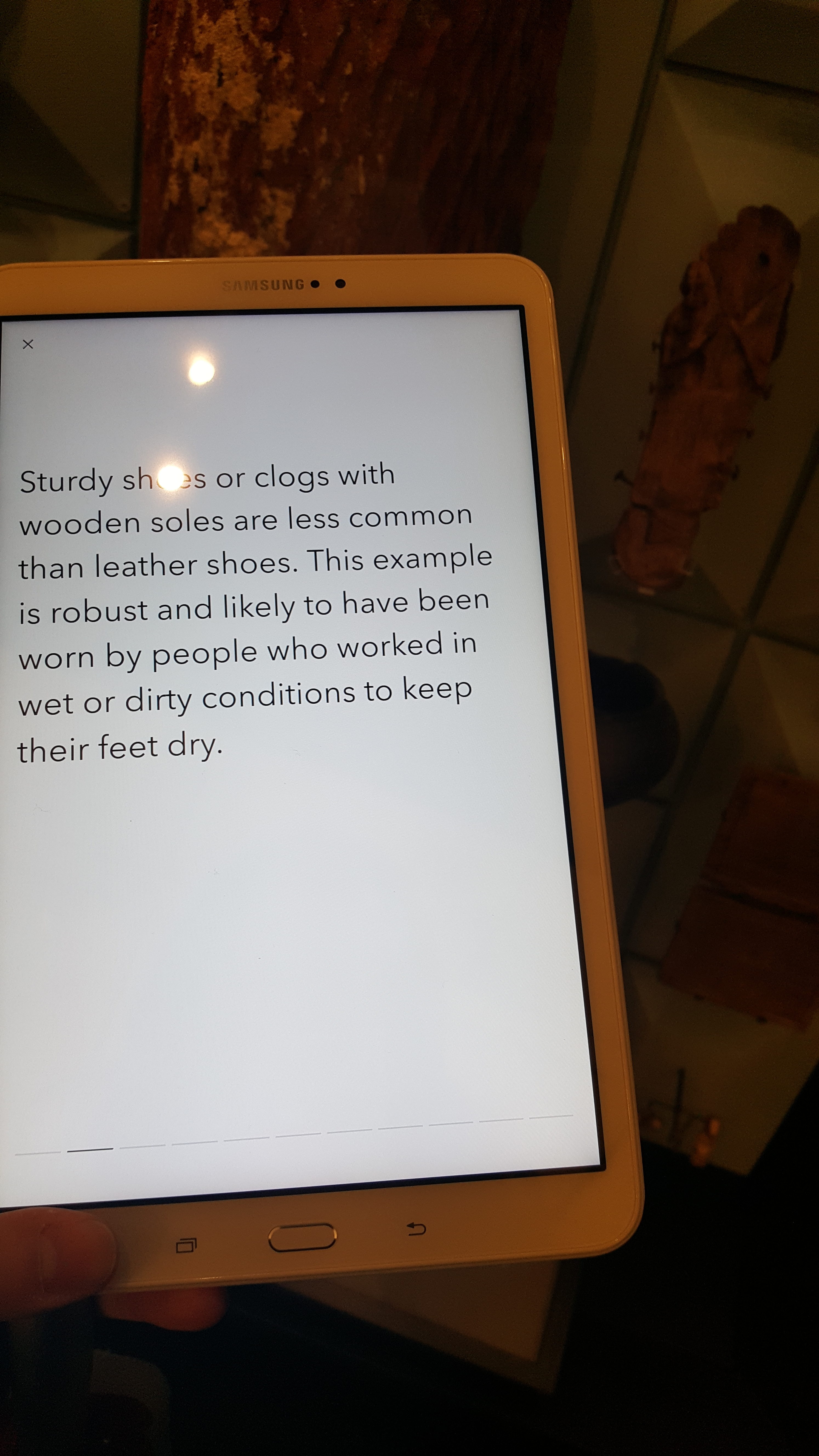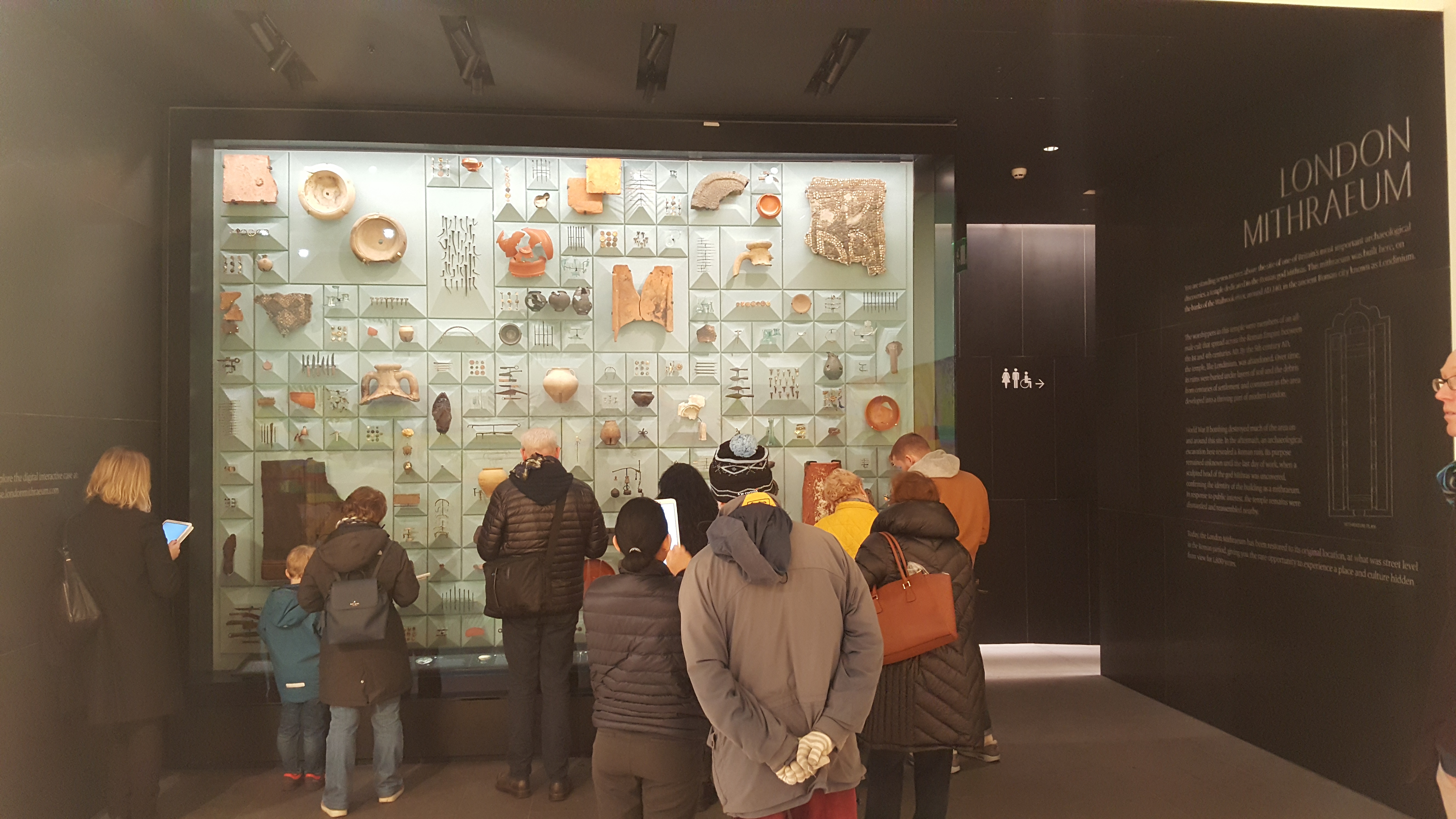 So what did Bloomberg do with it? Well, they built themselves some new European headquarters, but managed at the same time to relocate the Mithraeum back to its original site, several metres underground. (Originality, as a side point, is not discussed very clearly in the materials onsite – a Wikipedia entry claims that “A large majority of the stones and bricks are original”). Bloomberg have worked closely with Museum of London Archaeology (MOLA) to display a number of artefacts excavated from in and around the site, as well as to interpret the Mithraeum itself. The visitor experience goes something like this: book a free ticket online, turn up at allotted time and start in a contemporary art space at ground level. Depending on availability, a visitor host will hand you a tablet on which you can learn more about the artefacts on display, including shoes, pottery, jewellery, tools of various trades and the like (the area was originally very marshy so there is a surprising amount of organic material). Then you go down the stairs to what is essentially a waiting room before the big event, although quite a nice waiting room with models of key finds from the site, and Joanna Lumley narrating some key points relating to the cult of Mithras. Then, every 20 minutes, you go one floor down again to the temple, where there is an audiovisual ‘experience’: chanting in Latin, voices conversing, the sounds of a shared meal, all with atmospheric use of light to highlight different aspects of the temple in turn. Then back above ground and out again onto the City streets.