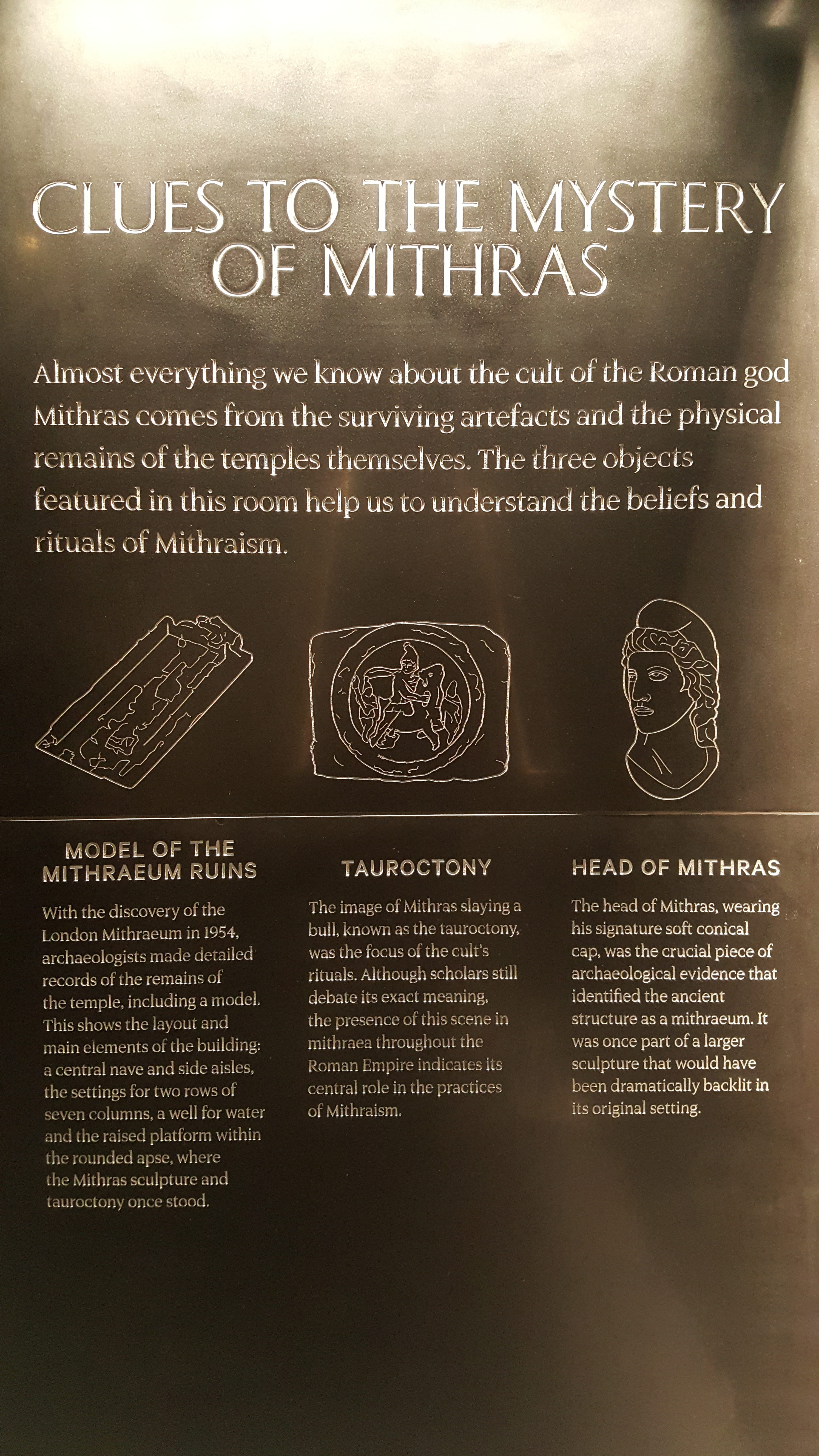 A bit of history first of all. To go back to the beginning, in the Roman settlement of Londinium, there once were temples, markets, houses, workshops and rivers, Walbrook St on which the contemporary entrance to the Mithraeum finds itself being named for one such. The people of Londinium had a number of options when it came to worshiping, the Roman Empire being a polytheistic sort of place, and if they ticked the right boxes they could worship at the Mithraeum. The boxes they needed to tick were A) being male and B) being an initiate of the cult of Mithras. Before our trip to the Mithraeum I confidently misinformed my Significant Other based on some half remembered Classics lessons from my youth: yes there is some sort of connection to Eastern religion but no it wasn’t a direct import from exotic lands, and yes there was something sacrificial going on, but no it doesn’t seem to have been quite as gory as I remember.