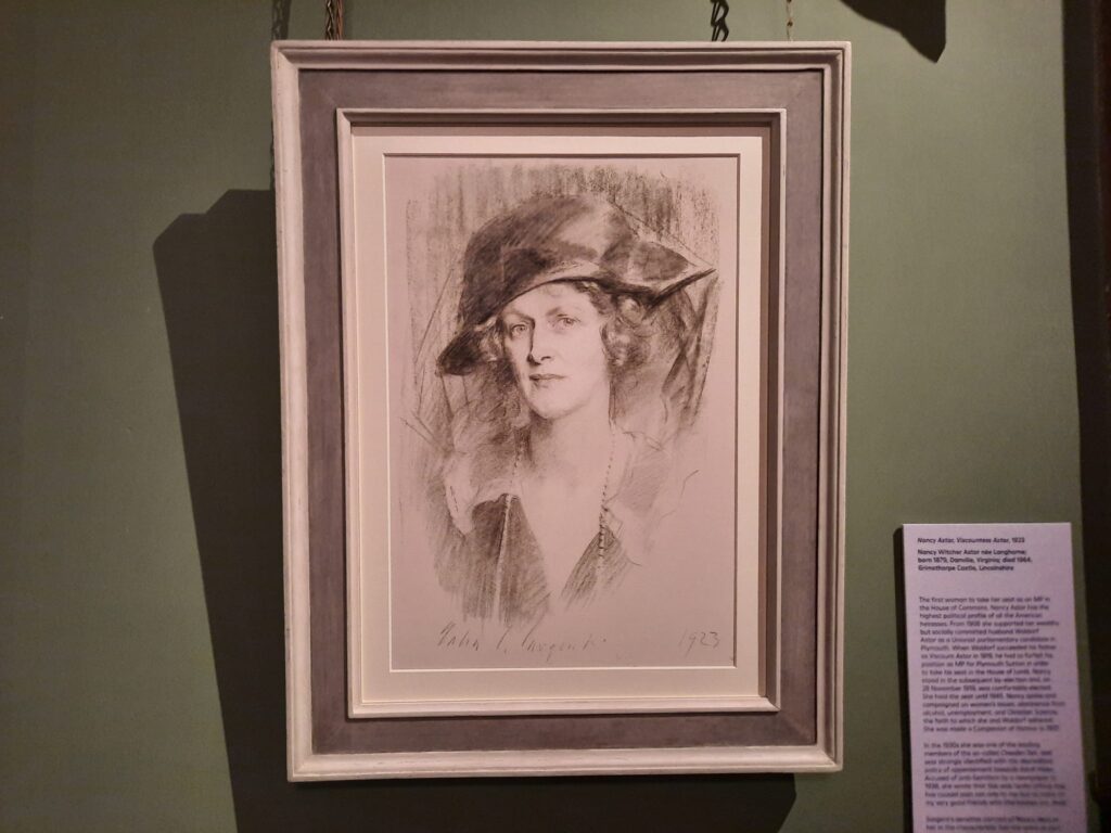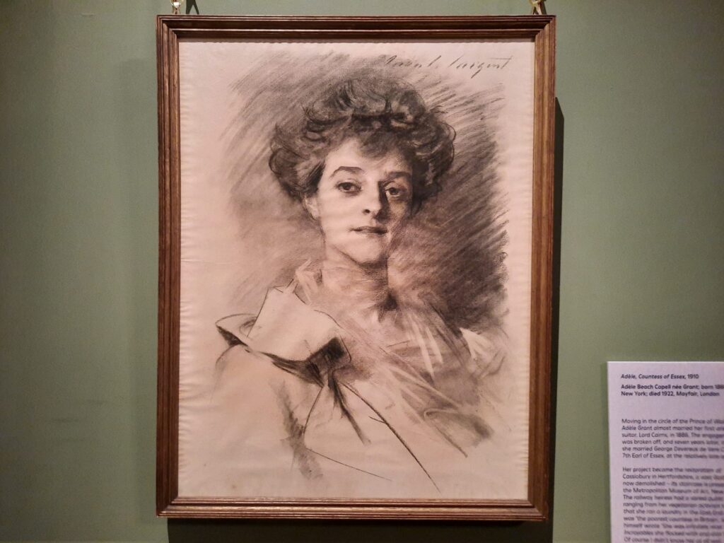 This exhibition – the first major loan exhibition at Kenwood in a generation – begins to challenge these assumptions. Rather than treating its subjects as avatars of social mobility, it restores them as individuals with agency and complexity. The portraits and accompanying captions exude glamour, but also candour, strength, and at times, even weariness. Anne Breese (later Lady Innes-Ker)’s love for dancing. Nancy, Viscountess Astor in her ‘political uniform’, designed to discourage press coverage of her outfits. A look of defiance in the sketch of Adele Beach Capell, Countess of Essex (née Adele Beach Grant). Sargent captures not just ornamentation but performance.