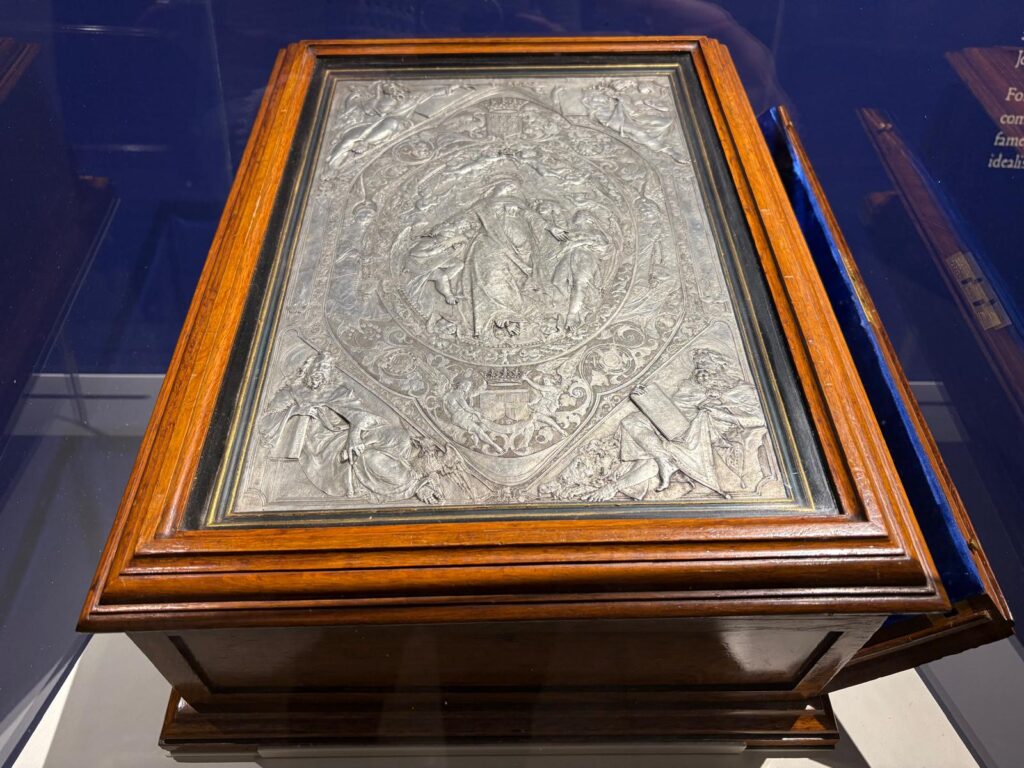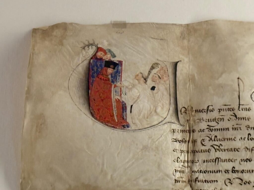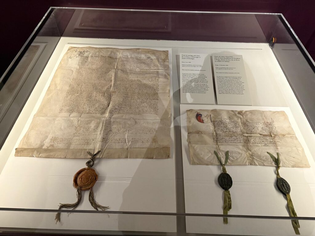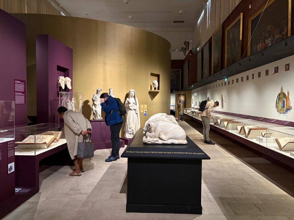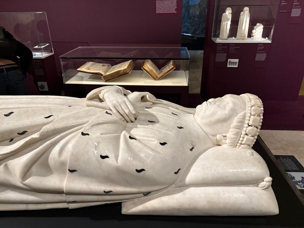 The exhibition builds momentum extremely well. The very first object, with the introductory text, is the manuscript’s custom wooden case. A reminder how precious this object is, and also that it is a devotional object rather than ‘just’ art. We then move into the exhibition proper. It starts by setting the scene. Introducing Jean de Berry and the duc d’Aumale, just as I’ve done above. There’s a good selection of archival documents, from Jean de Berry’s marriage contract, to letters pertaining to the manuscript’s 19th century acquisition. Jean himself is also there, taking up the centre of the first space, in the form of his funerary monument. He’s a big personality throughout the exhibition.