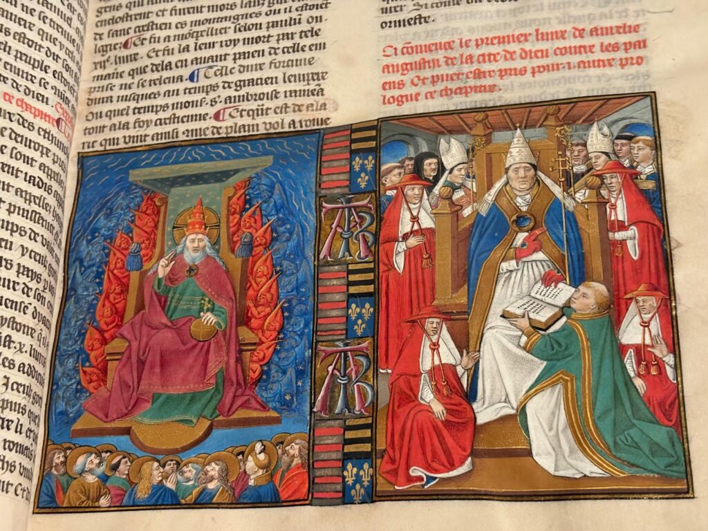 We then move into his collection. Works are divided by subject: philosophy, science, history, etc. The illuminations are striking, but we know better is coming. Nonetheless, I start a habit that probably annoyed the attendants, of getting so close to the glass cases I had to hold my breath so as not to fog them up. The other option, which several older attendees had thought of, was to bring your own magnifying glass.