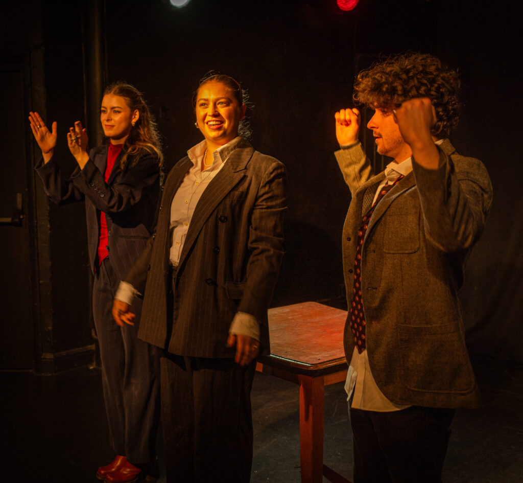 We open on Keira Palmer (Cassia Crimin), the newly elected PM whose only clear ideology seems to be โstay in power.โ Sheโs flanked by a Foreign Secretary (Cameron Wight) more interested in banter than cabinet briefings, and a Comms Director (Molly Kerrigan) seemingly promoted well beyond her capability. Together, they lurch from one disaster to another. The style owes plenty to The Thick of It: cut-glass dialogue, panicked spin, and characters who were clearly never built for high office. The execution is impressively deft. Soundbites ping in from Murdochs and world leaders, while a projector flashes up maps and press footage. Simple lighting recreates the press scrum with minimal fuss. Thereโs a satisfying rhythm to the whole thing: short scenes, big laughs, then onto the next indignity. And it really is funny – the audience laughed often and loudly.