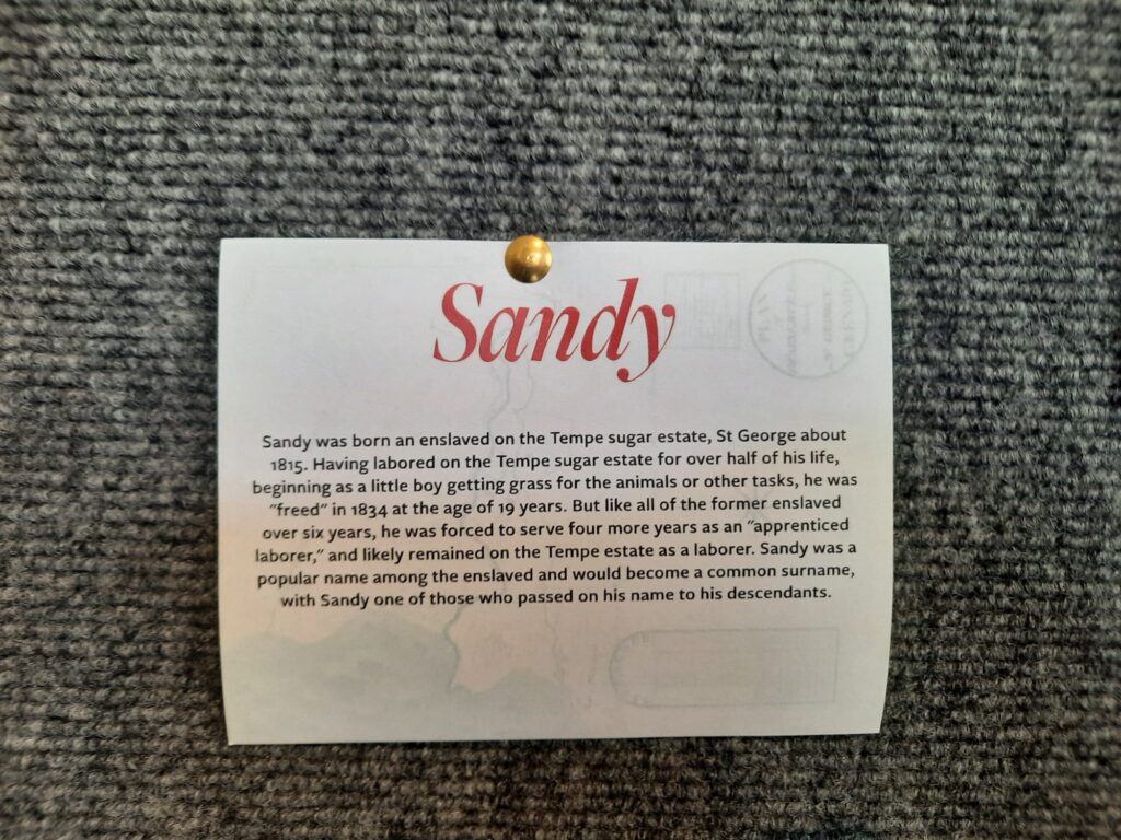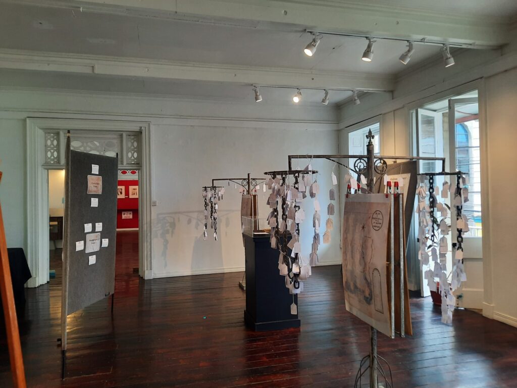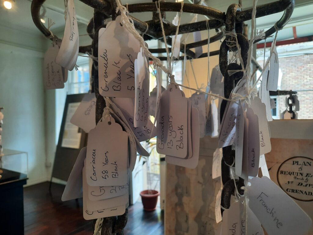 The format of the exhibition itself is very simple, and documentary. Large pin boards bear the names of several estates, with the names of people who worked there pinned around them. The names recorded by plantation owners were, of course, often names given to enslaved individuals to distance them from their previous homes and identities. That is teased out, while there is also an acknowledgement that these given names also formed part of new identities. The scale of Grenada’s population of enslaved people is represented by many little white tags: names inscribed where known, or blank where not.