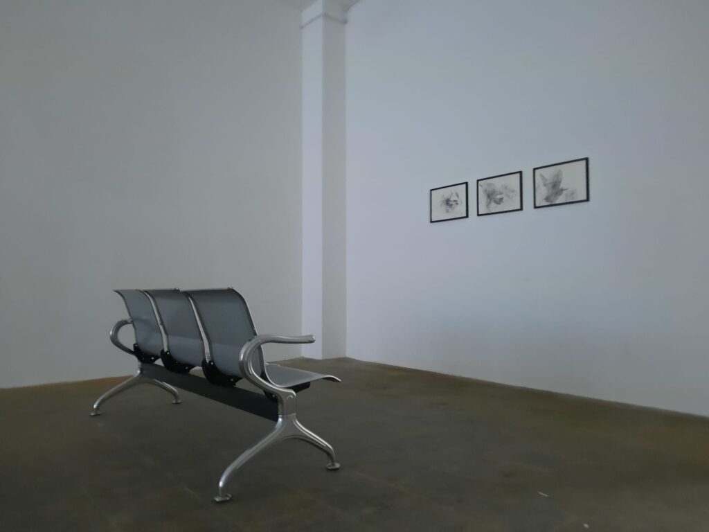 If Rahal’s film is restlessly looping through layered futures and memories, the installation at the other end of the room is slower, heavier. A waiting room, or something like it. Hard chairs face off against a trio of artworks. A close look at the seats is rewarded with a Home Office slogan from a notorious anti-immigration campaign. The artist’s description of the installation, “Waiting as Material”, is telling. The work suggests that waiting is not a passive state, but something constructed or enforced. Time weaponised.