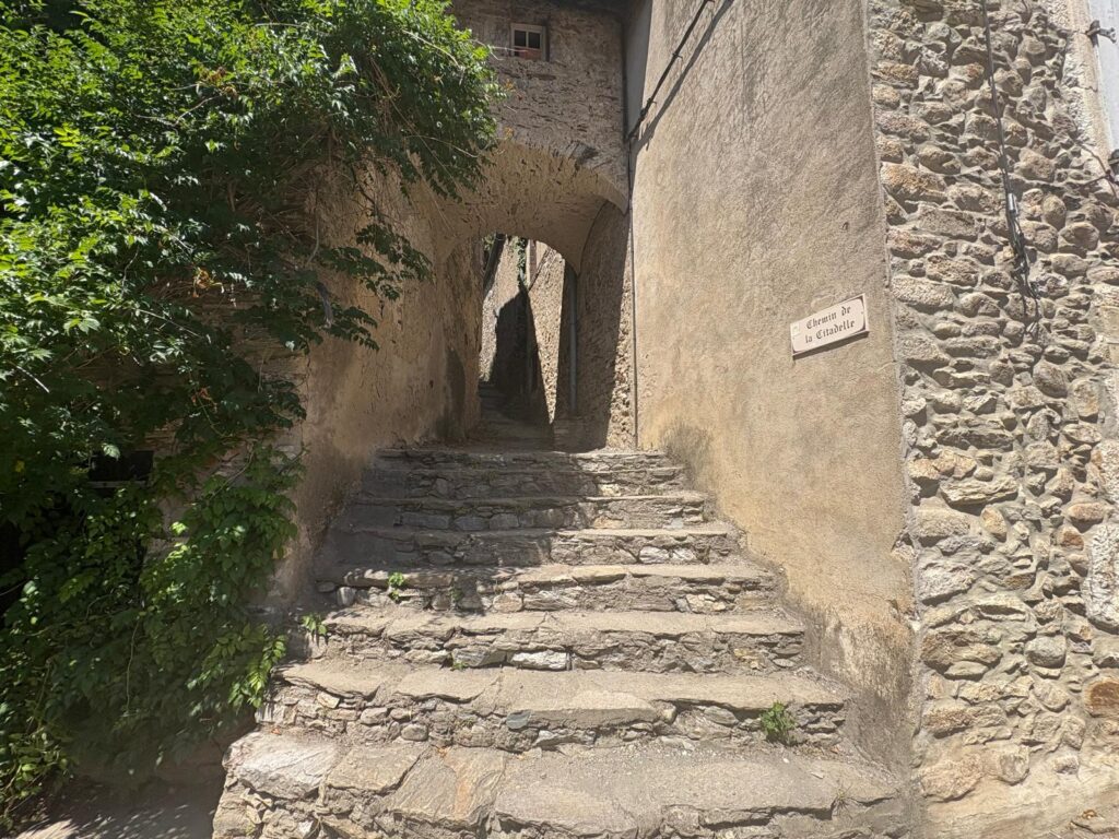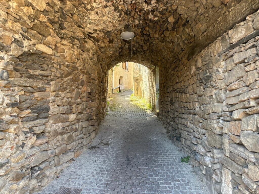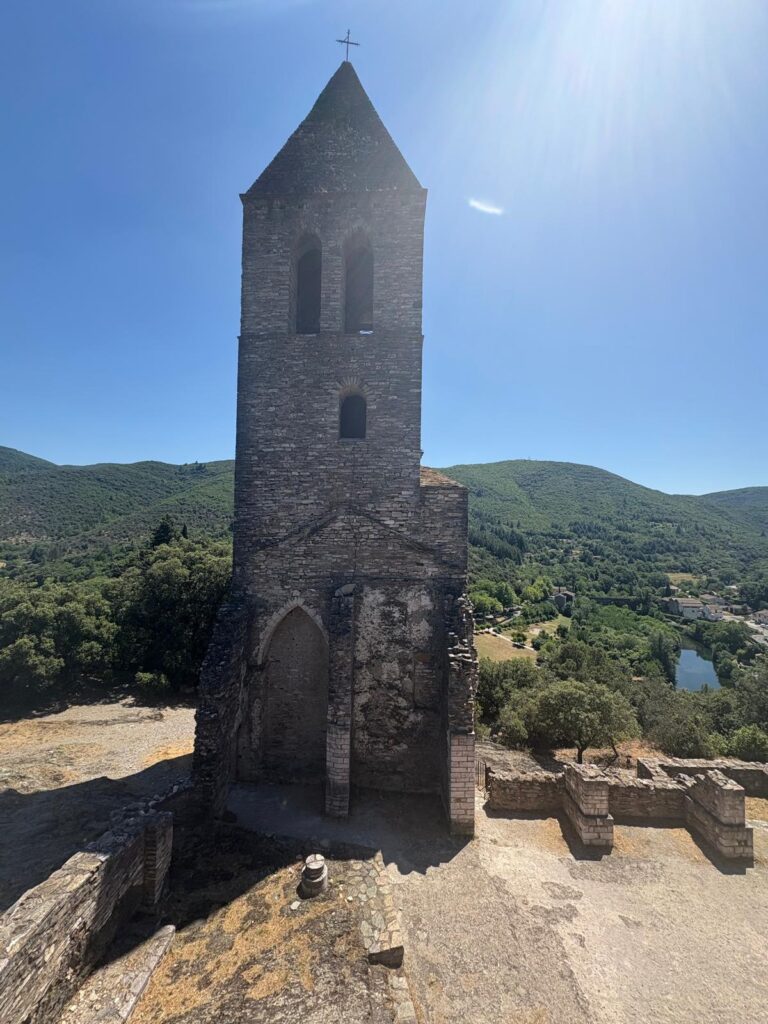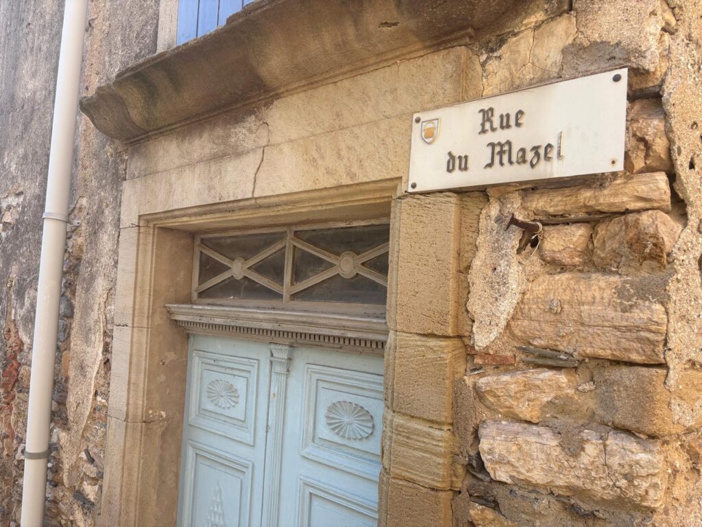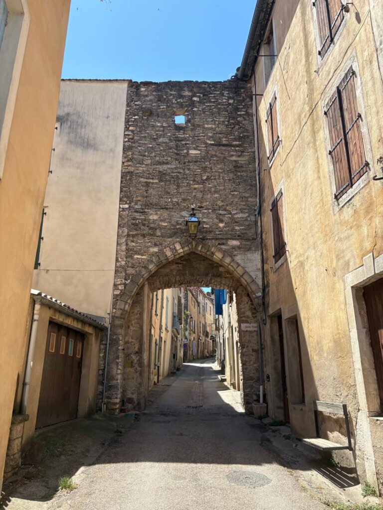 I left the Urban Geographer sitting under a bush (I’m not kidding, there he is by that signpost) and continued on up the hill.Here is the original Église Saint-Laurent. Or its belfry at least, which is all that is left. This is a Romanesque church (12th-13th centuries), and sits atop Olargues as part of what was once the citadel (castrum in Occitane). Interestingly, before it became a church, this same spot was the site of the castle’s dungeon. Both the castle and the church were ruined in the 15th century.The remainder of the citadel is now ruins. Very minimal signage and many places to break an ankle, but fun if you like archaeology as much as I do.The 360 degree views from up here are stunning. That’s the Jaur, down below, which we crossed earlier on the “Eiffel” Bridge.Goodbye to the church and citadel as I head back downhill and collect the Urban Geographer.Le Chemin de la Citadelle (the Citadel Path) is wonderfully medieval.A little further on, the rue de Mazel is a reminder of that long period of unrest. Mazel means butchery, and refers to the capture of the town during the Wars of Religion (1562-1598). The rue des Pilles Antiques (Street of Ancient Pillages) likewise.Let’s continue on down through more medieval streets.