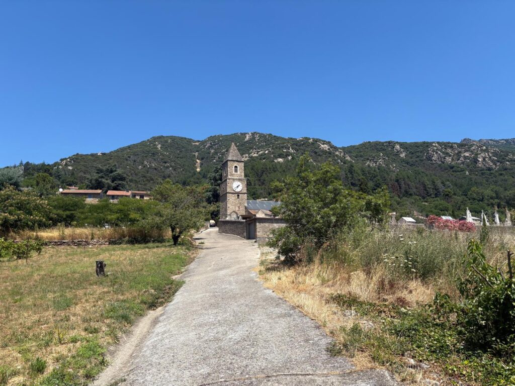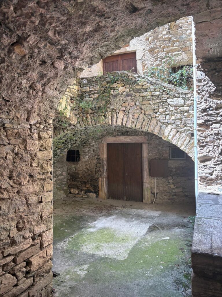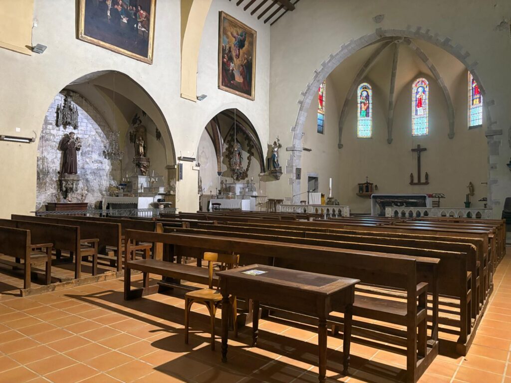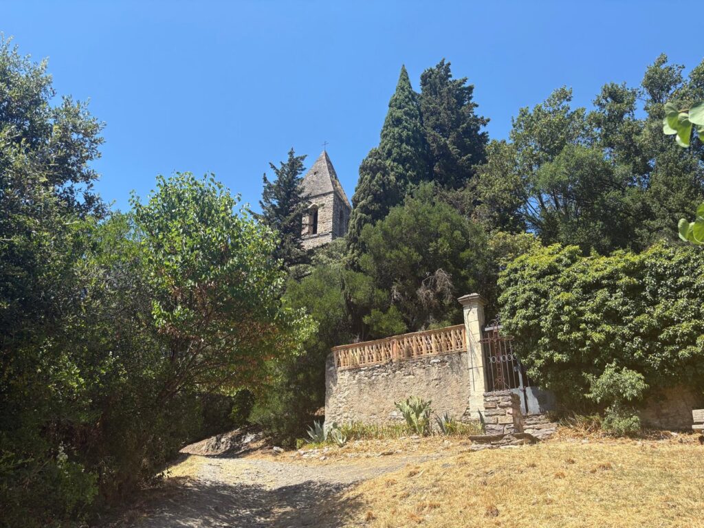 Here you have, viewed from opposite sides, a fragment of the ramparts of Olargues. This was the Porte Neuve, one of the main gates. The app tells me it used to have a portcullis and drawbridge, which you can just about imagine in the second image.More evidence of the fortifications that once were.The app took us on a small detour here, which annoyed the Urban Geographer no end as he was hot and tired already. But the interior of l’Église Saint-Laurent was cool and welcoming. Or the porch at least, as you can’t visit the rest outside of services (I presume, unless this was also a siesta situation). But this wasn’t the original Église Saint-Laurent. We’re about to see that, up the hill.