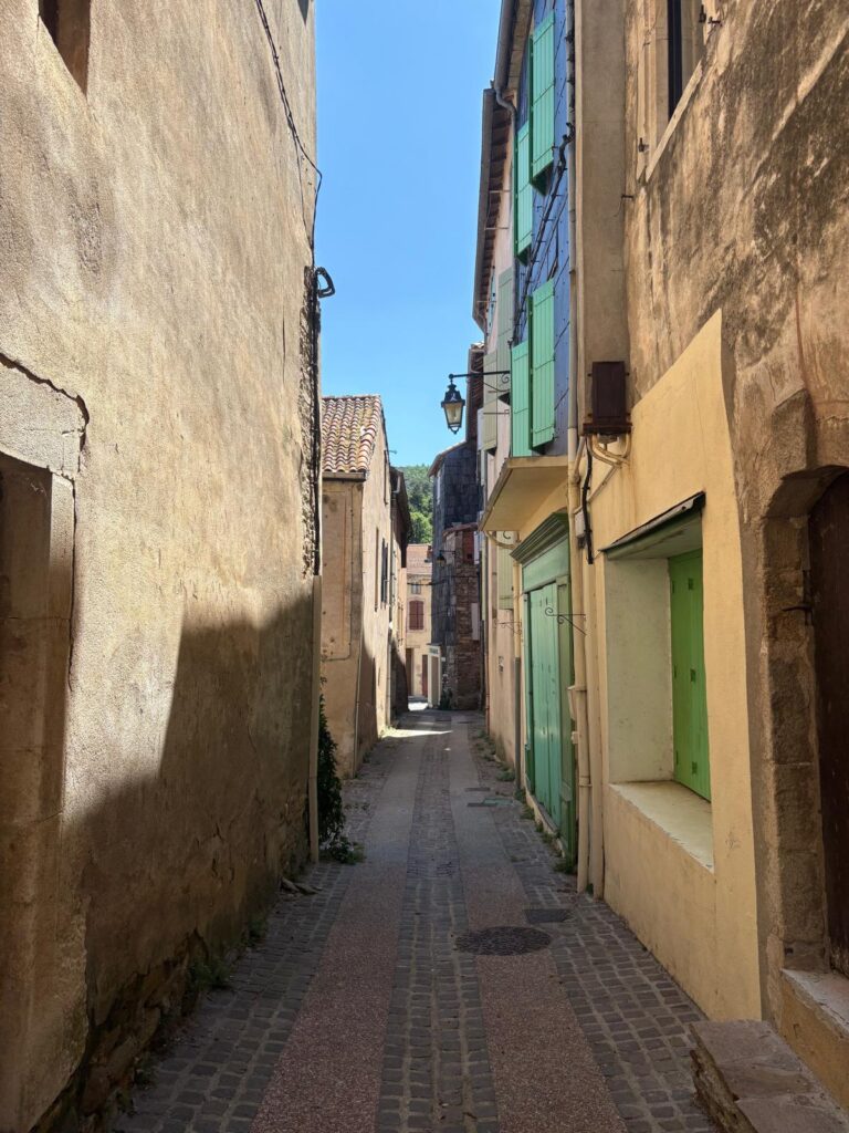 It’s definitely true what they say. Only mad dogs and Englishmen go out in the midday sun. Or walk to neighbouring French villages in the afternoon heat, as was the case here. No long-time readers will be surprised: the Salterton Arts Review is totally incapable of sitting still when in a new place. So on a recent trip to France, after a busy cultural weekend in Chantilly and venturing down to Occitanie to stay with family for a few days, a free afternoon became an opportunity to go exploring. From the lovely village of Mons, it was a short walk down to a walking/cycling path along a disused railway. And from there, just a slightly longer walk to Olargues. Not a bad idea, right?