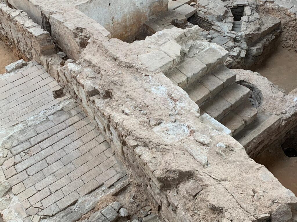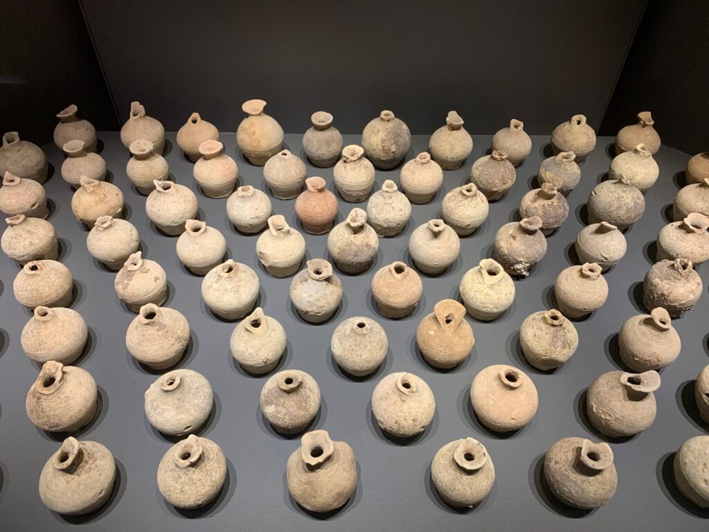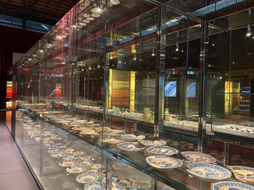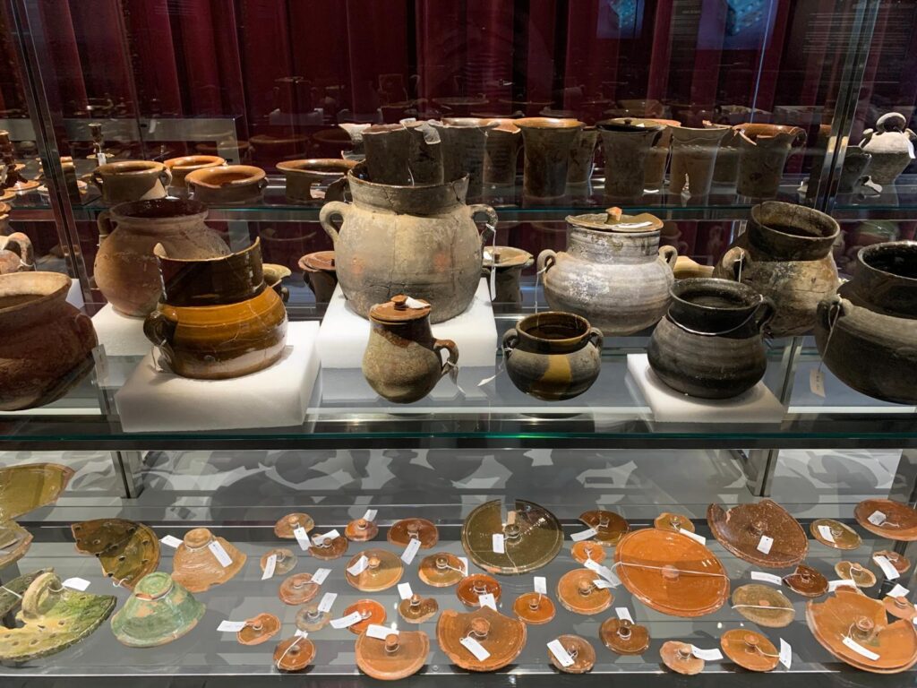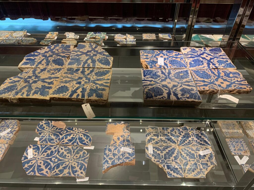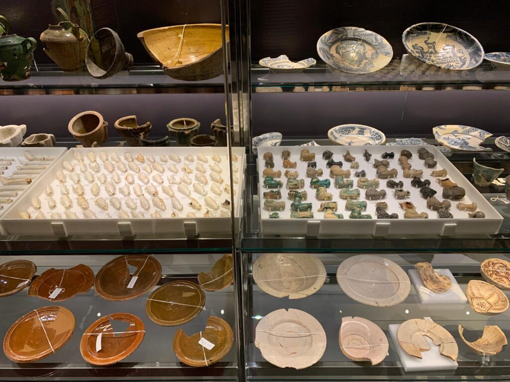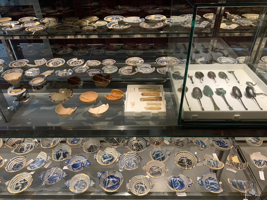 This exhibition takes up one of four internal spaces used for cultural activities (talks, temporary exhibitions and events) but it feels particularly well-matched to its setting. It brings some of the content quite literally back to the bare stones of the archaeological site. Hundreds of ceramic vessels, floor tiles, tools, ornaments and domestic items are laid out artfully, with thoughtful interpretation about their creation and use. A short introductory video helps to set the scene. A longer film near the end provides a more detailed historical background, alternating between languages.