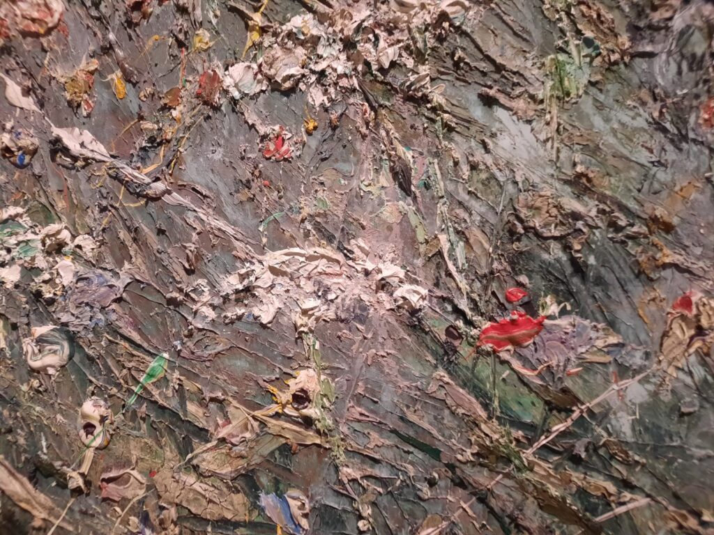Already at this early stage we feel Van Gogh’s influence. Directly across from the entrance is a 2019 work, The Crows. That high horizon line, the crows circling, the impasto texture of the straw. The shellac and gold leaf may not be a leaf from Van Gogh’s book, so to speak, but the rest is. More Van Gogh-esque compositions, including a vase of sunflowers, round out the first impression.
