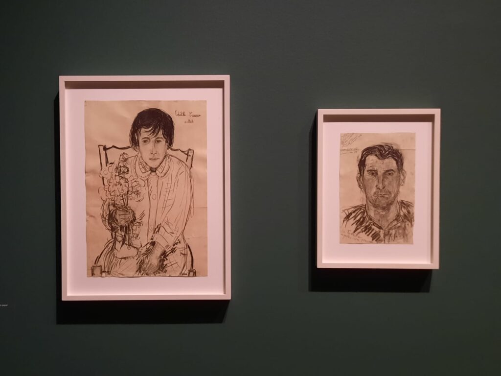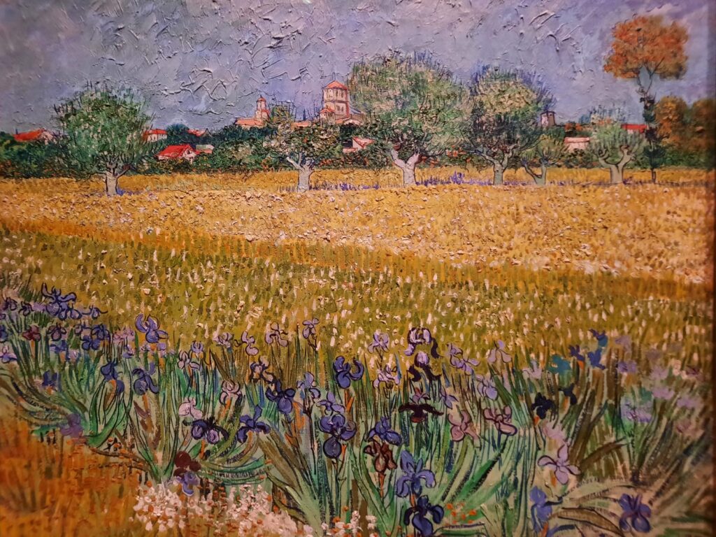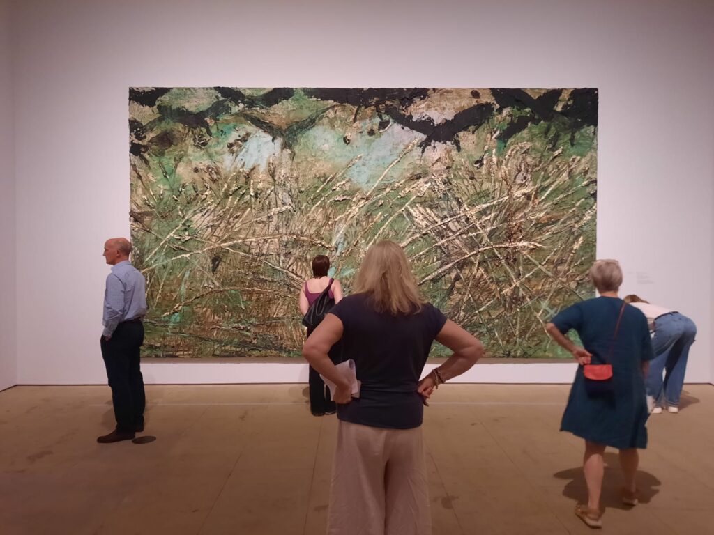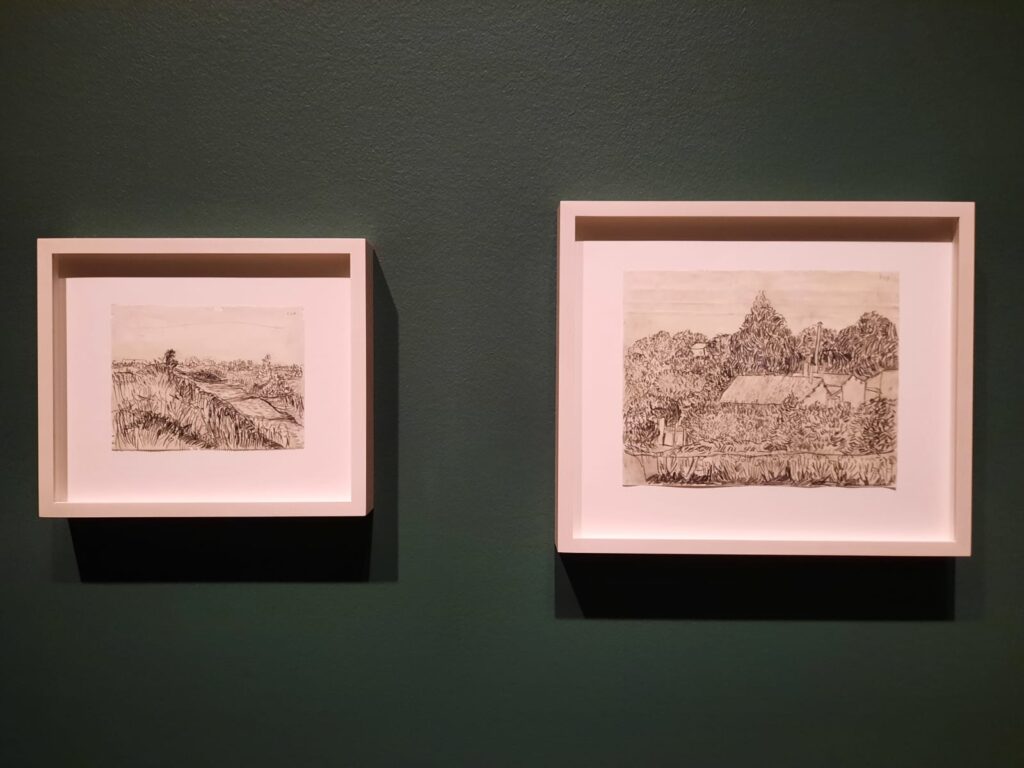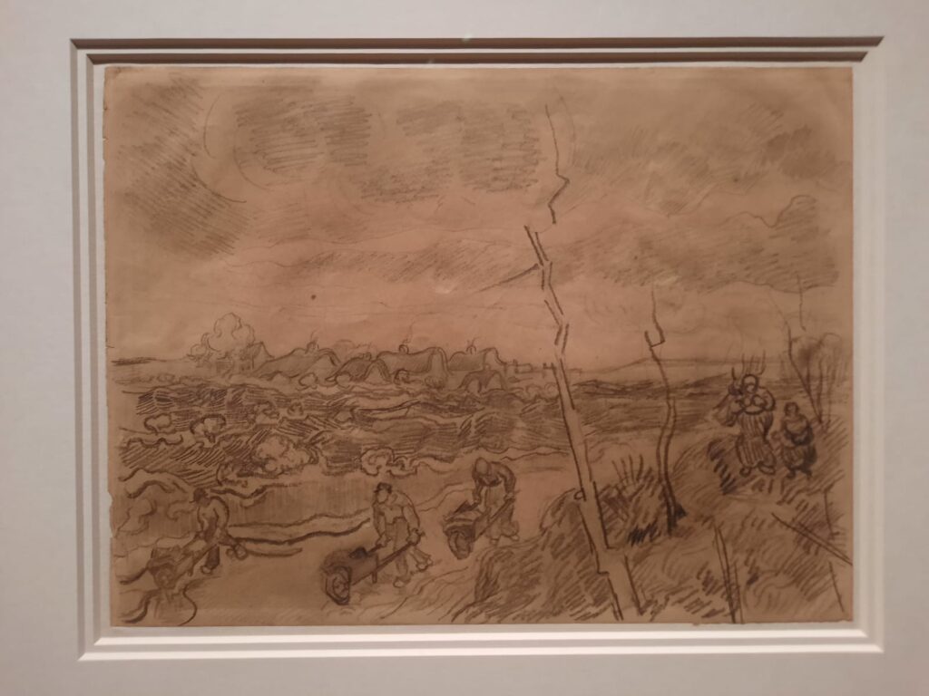 Moving into the next room, there’s more balance between the two artists. We’re in Arles now, where Van Gogh lived in 1888-89, and Kiefer visited in the summer of 1963. Both captured the town’s inhabitants and landscapes, in works on paper and canvas. There’s a beautiful painting by Van Gogh, again that high horizon line with a town hidden by trees at the top, irises at the bottom, and fields in between. For the works on paper it’s sometimes hard to tell whose works are whose. Except, of course, when Van Gogh’s characteristic swirling outlines creep in.