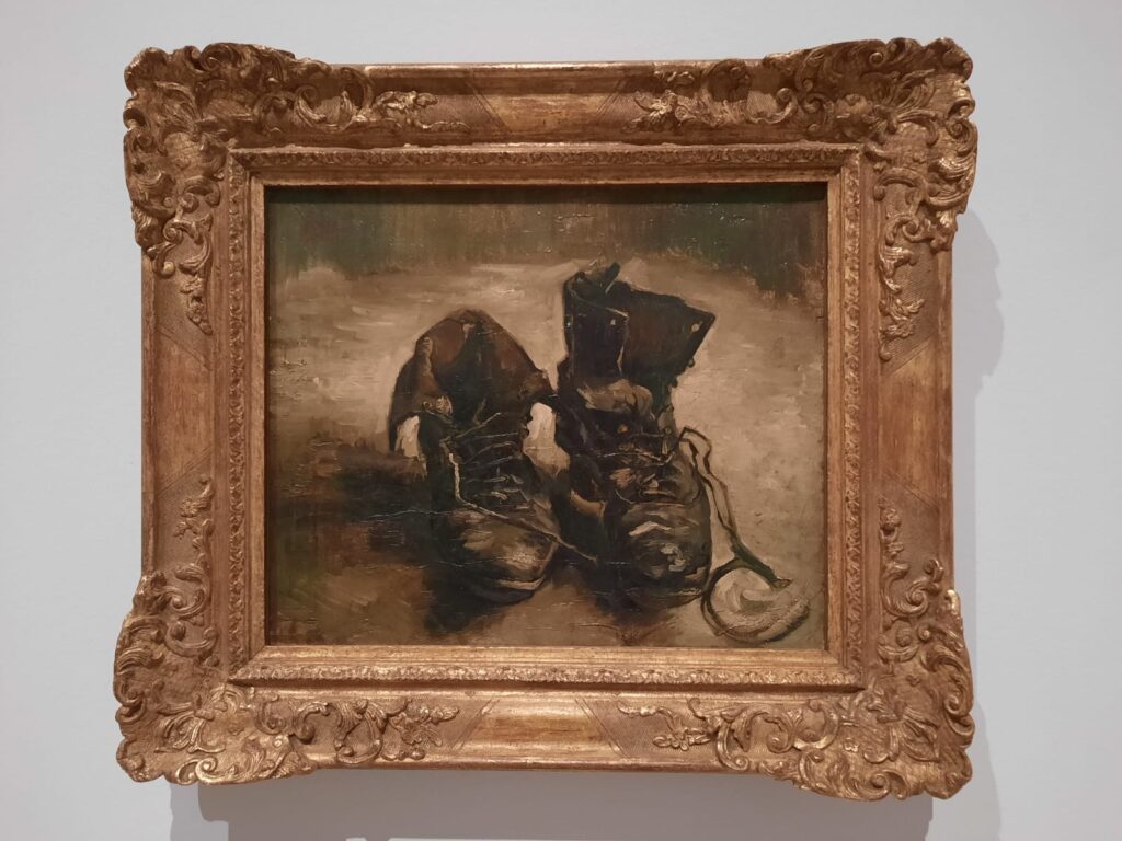 And then we have that impressive vista as we enter the final room. The Starry Night (2019) by Kiefer, here courtesy of the artist and White Cube. No denying that connection any more, it’s drawn across the canvas in swirling straw and gold. The other works in this room by Kiefer are similarly monumental, and include one sculpture and an example of his incorporation of metal objects projecting from his canvases (in this case a scythe). Again there’s just one work by Van Gogh, a small painting of an old pair of boots.