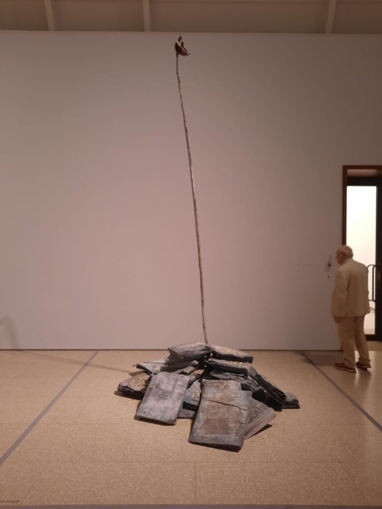 Kiefer’s art is by no means all about Van Gogh. Mythology and literature are also sources of inspiration for his work. He works, as I mentioned earlier, in mixed media. Largely meaning works on canvas, but as well as paint there might be straw, lead, or other materials. We see examples of these works in the current exhibition. Kiefer has a recurring interest in the alchemical properties of materials, and sometimes subjects them to processes including acid baths or burning to represent their energy and potential.