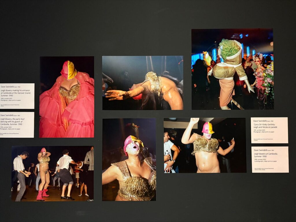 As far as we know from this exhibition, Bowery entered this world fully formed. His early appearances showed a commitment to scale and difficulty that set him apart. Bald caps, masks, and foam constructions turned his body into a sculptural site. Zippers appeared where mouths should be. Lycra smoothed away joints and erased anatomy. Bowery was one of the few who pushed this “club kid” ethos to its furthest extreme, creating looks so sculptural and strange that they demanded to be treated as artworks. His fusion of glamour and grotesque owed something to Dada, something to Leigh’s Australian theatricality perhaps, but also something to the urgency of 1980s queer identity politics. And yet his practice also relied on sewing skills learned at home and an outsider’s instinct for scale.