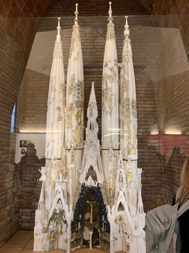 Many details in the museum caught my attention, but a few deserve special mention. One was a model of Gaudí’s parabolic arches. Gaudí made this to inform his work: physical structures made from string and weights, hung upside down to reveal perfect forms. Gaudí then inverted the curves to create stable, gravity-informed arches. The museum has a simple model in plastic and string which visitors can get their hands on, learning in this way that nothing in this or Gaudí’s other works was left to chance. It’s all taken directly from nature. It feels like entering his creative process.
