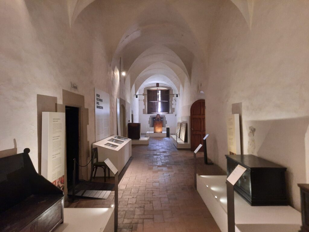Elsewhere, the museum brings the convent’s history to life. There are nun’s cells recreated behind glass, giving a sense of how simply and sparsely the nuns lived. Their wooden beds and shelves contrast beautifully with the rich decoration in communal devotional spaces. One of the most oddly memorable exhibits for me, though, was a temporary exhibition on the monastery’s historic furniture. Wardrobes, camp beds, chests, stools: items that feel completely ordinary, and yet have become historic artefacts through survival and reuse. They speak to the lives lived here. Not grand, but grounded.