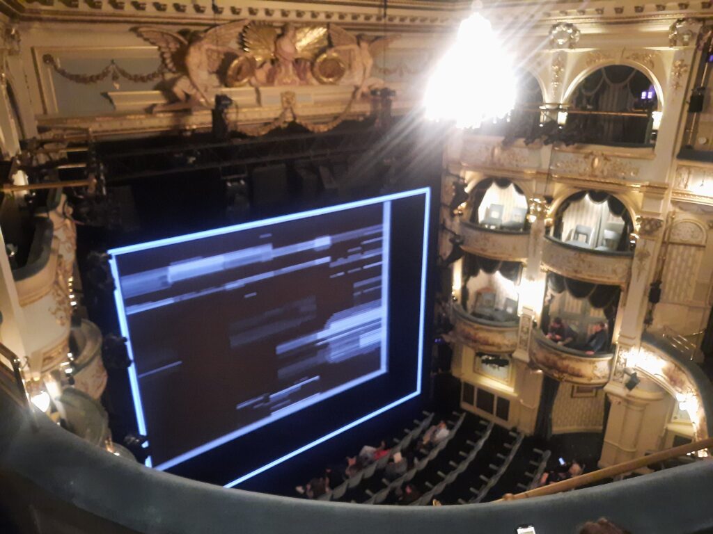 The set design (Joanna Scotcher) contributes to the play’s ambiguity. Between scenes, screens come down and enclose the entire set, apart from a small opening through which Shakespeare appears to interact with the audience. Large-scale projections (Andrzej Goulding) of the actors’ faces show tortured expressions. But did it happen, or did it not? Did it happen like this? Questions the play asks but, wisely, doesn’t always answer. Or leaves room for doubt, in any case. After all, history is written by the victors, isn’t it? And is the victor in this case the most famous playwright who exists, or the one who ended his days in a brawl in a pub in Deptford? Unless… that isn’t how it happened?