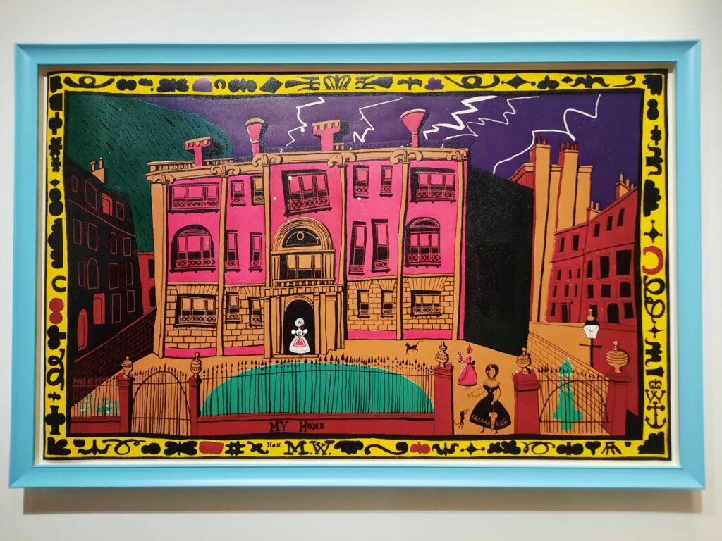 I’ve written before about Madge Gill here, and there are other posts on the Salterton Arts Review that circle around the subject of so-called “outsider art.” I say so-called because the terminology has always felt unsatisfying to me. ‘Art brut‘, ‘outsider art’, ‘naïve art’. Each carries its own baggage, and none quite captures what I find so compelling in these artists’ work. Perry offers a better phrase: “spontaneous artists.” I rather like that. It suggests creativity bubbling up unstoppably, regardless of formal training or social constraints.