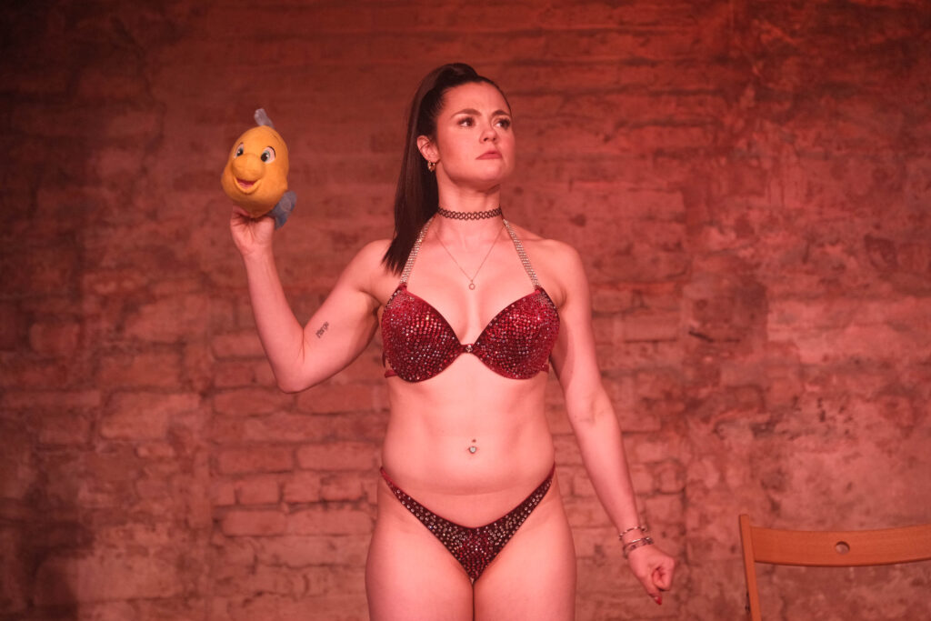 The show acknowledges both sides of the feminist debate on sex work – empowerment versus exploitation – but doesn’t try to resolve it (thankfully, given the 70-minute run time). It stays deliberately personal, well-researched, and carefully structured. It’s also shocking and uncomfortable. Prescott is the one calling the shots. Choosing minimal costume and full-frontal nudity, she puts the audience in the role of voyeur. Projections on the back wall (a tabloid countdown to “legal age” or common porn category searches) underline how normalised the sexualisation and objectification of girls and women has become. We can be victims of this culture, but also complicit.