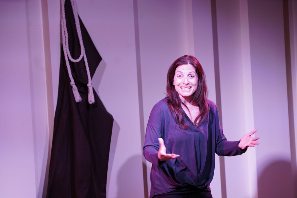 This is a really interesting story to tell. Though at such a distance that audiences today might not always feel immediately connected. Religion looks very different to us now. Elena Mazzon bridges that gap with a lively format: the show is delivered straight to the audience, with moments of participation, and even a hymn I found myself humming on the way home. She shifts between roles: the Popess Maifreda, an Everywoman guide, and various characters (mostly women, but also one man) met along the way. They are 13th-century figures but modernised in speech and attitude, which helps make their world accessible without feeling forced.