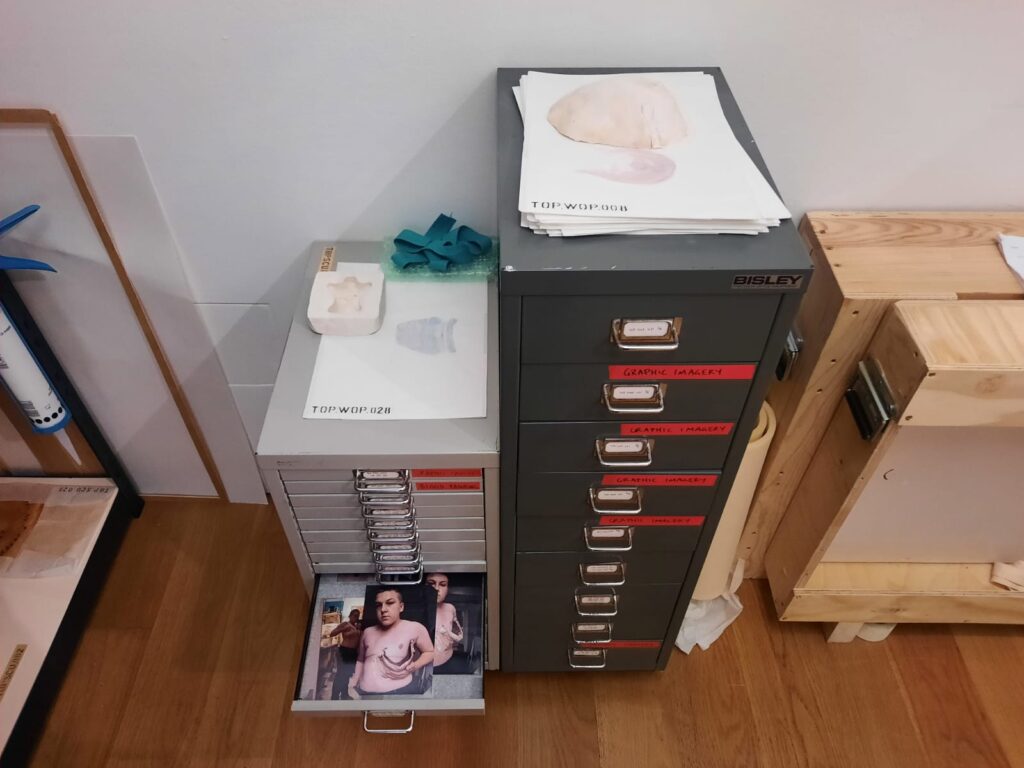Top by Claye Bowler is on now at Queer Britain. It’s an intimate, archival-installation piece mapping a seven-year journey through the UK’s healthcare system to access gender-affirming top surgery. Bowler, who also works as a museum registrar, brings that institutional lens to the work. Top is disguised as a museum store full of drawers, unlabelled objects, letters, drawings, and collected ephemera. The lack of overt labels in many cases forces the viewer to be bold and explore (eg. can I open that drawer?), mirroring how trans people must often navigate the medical system without clear guidance or full knowledge. Bowler’s professional experience in collection and registration (i.e. what museums collect, how they store, what they deem worthy of documentation) becomes a metaphor for which trans lives get recorded, preserved, or erased.
