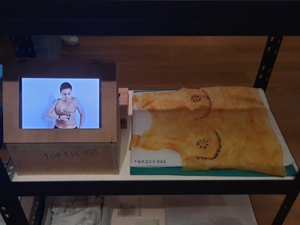 Bowler’s practice has engaged with queer/trans narratives and archives before. He questions what stories cultural institutions choose to keep and produce alternative archives of memory, identity, body. In Top, Bowler’s inclusion of preserved human tissue, fluid-drawings (blood etc.), letters and materials traces the physicality, emotionality, and procedural grind of this aspect of transition. It is shocking at times, but it’s also deeply personal documentation, both methodical and rigorous. As someone who’s worked in museums, the “behind-the-scenes” setting feels accurate. The drawers, the inventory, the desire to explore. It cleverly underscores the ambiguity and agency in those spaces.