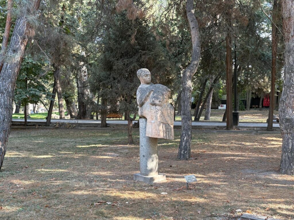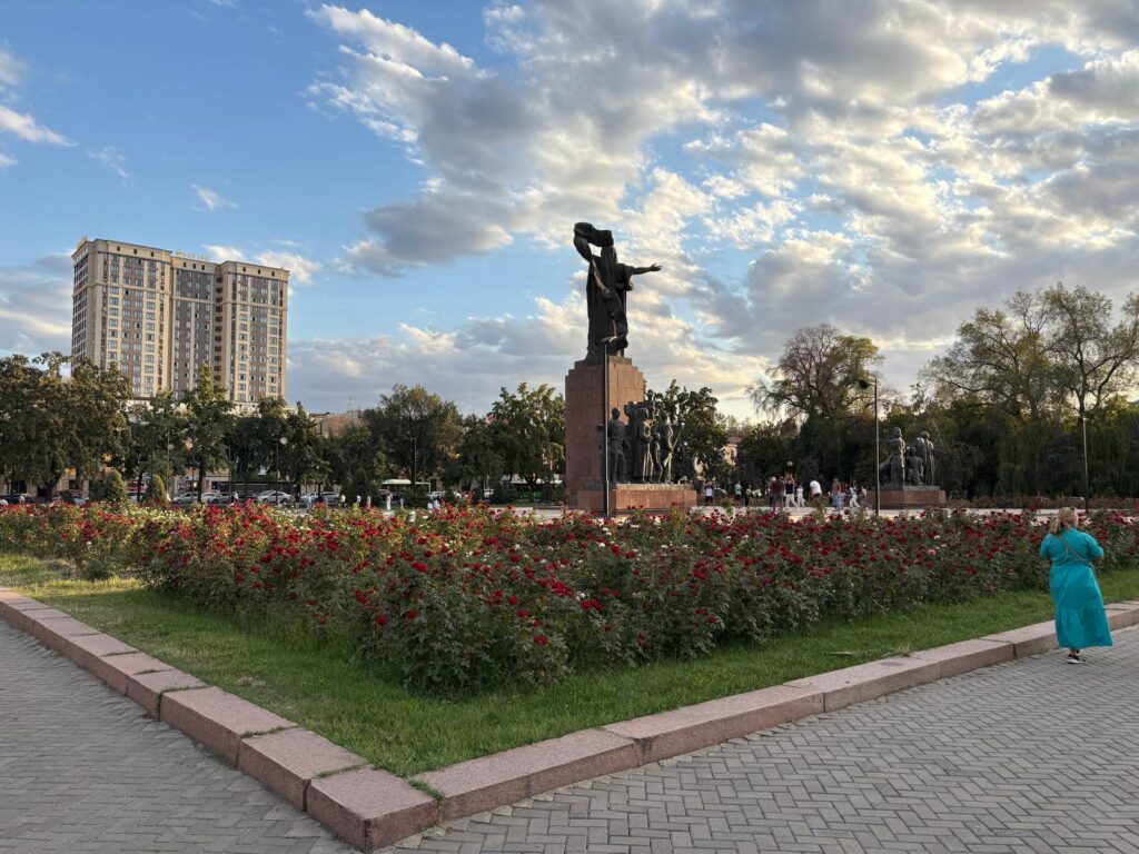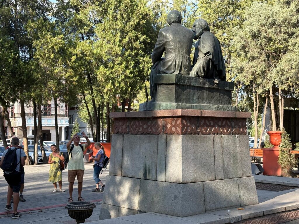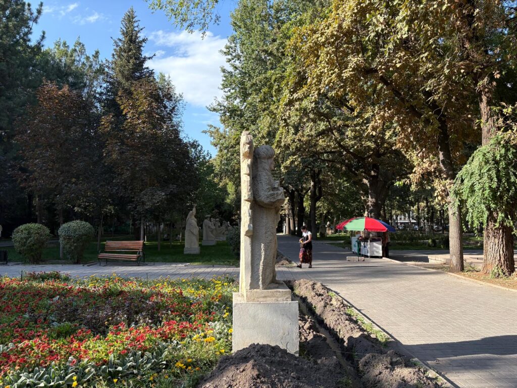 - Dubovy Park. A nice, centrally located park which is popular with locals. I even saw a TV drama being filmed here. There are shaded paths and bright flowers, as well as the Open Air Sculpture Museum. This is just part of the park and freely open to the public, with a number of sculptures commemorating the 60th anniversary of the Kyrgyz ASSR on the theme of “peace and labour”. It was nice even while undergoing renovations when I visited. Look out as well for the statue of Marx and Engels in conversation: Kyrgyzstan is apparently unusual in Central Asia for retaining some Soviet-era sculptures (there are a few of Lenin around the city, too) as an acknowledged part of its history.