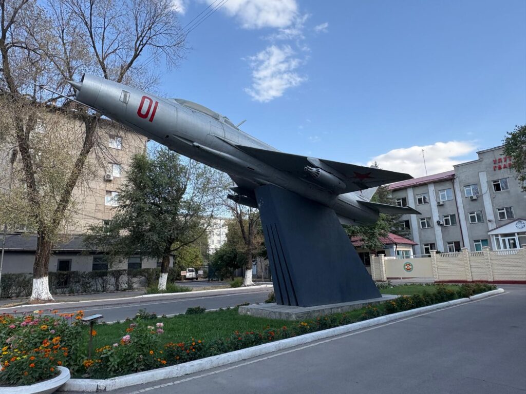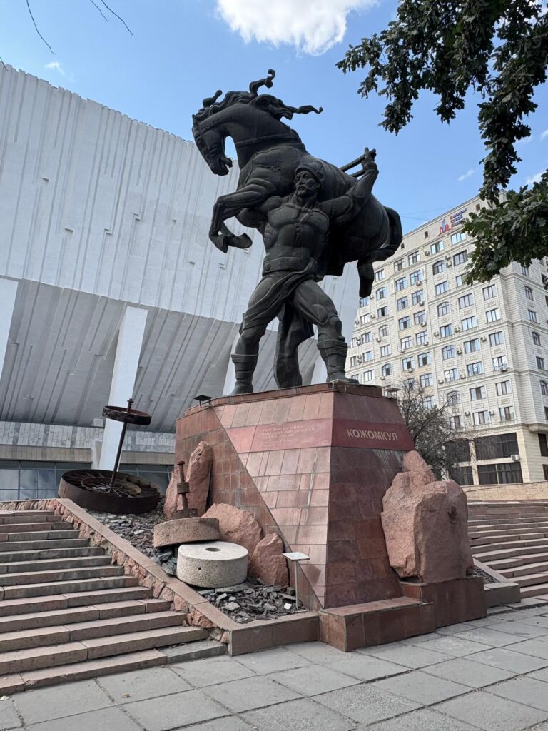 Then there are the city’s monuments and sculptures. I’ve mentioned a few already, like Marx and Engels in Dubovy Park. Don’t miss the statue of Lenin (in ‘pointing to the future’ mode) behind the National History Museum. He used to be in Ala-Too Square but has been downgraded. More modern monuments commemorate those who have fought to protect democracy in Kyrgyzstan. Then a fun one is the statue of Kojomkol near the stadium (on the same street as the Tinibek Sadykov Museum). Kojomkol was a semi-legendary giant and strong man: I’ve seen many a statue of a man on a horse, but never a horse on a man before. There’s also a spot where you can compare the size of your hand to his. Finally, pass by the headquarters of the National Guard on Kievskaya to see an old MiG fighter jet.
