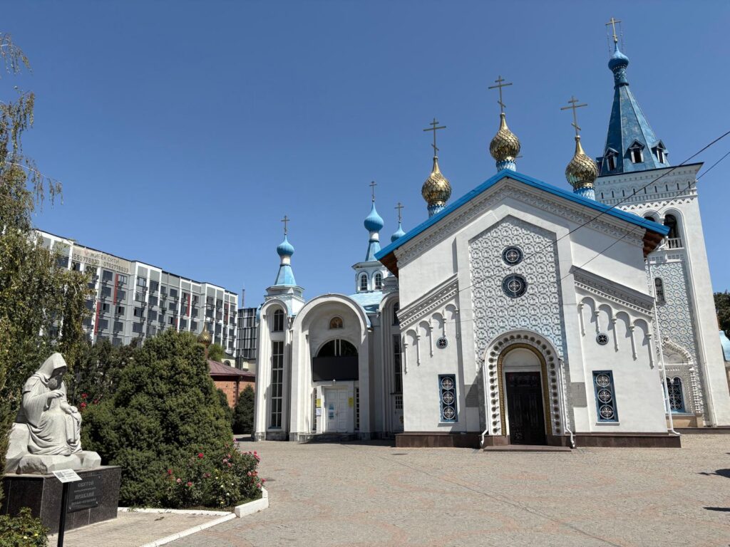 - Russian Orthodox Cathedral (fifth and sixth images above). The cathedral is to the North of the central city, on main avenue Jibek Jolu. It dates to 1947: without finding much online to back me up I’m going to guess that religious repression lightened up in the post-Stalin period, but this one somehow got a head start. The cathedral’s blue domes are cheerful, and the interior peaceful.