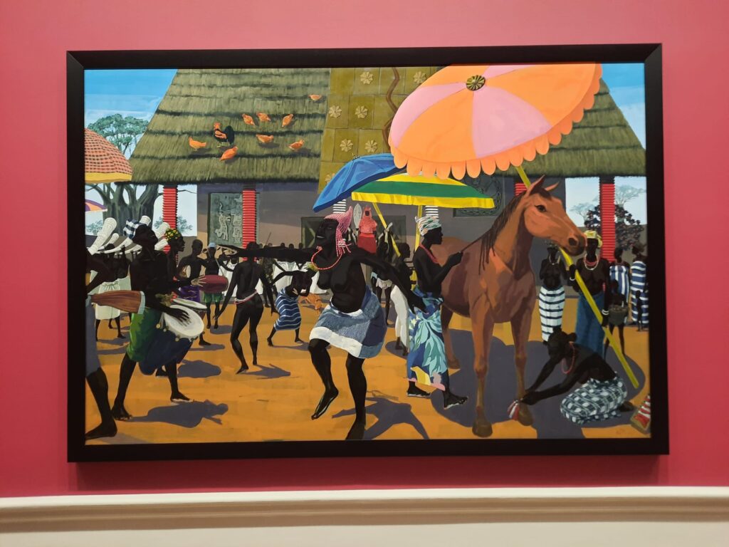 Many of the figures look directly out from the canvas. The gaze is steady, direct, and unembarrassed. Thereโs confidence in that, but also a kind of levelling: if weโre looking at them, theyโre looking back at us. Itโs a reminder that representation isnโt a one-way act. Marshall’s figures take up space, they return the gaze, they demand to be met as equals. They also make us conscious not just of history, but of our participation in it.
