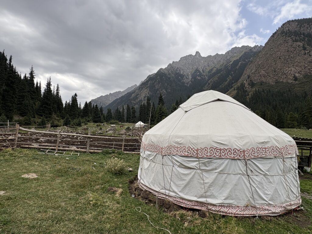One aspect of hiking in Kyrgyzstan’s highlands which makes it hard to shake notions of the romantic Silk Road entirely, is the concept of Jailoo. Jailoo are summer pastures. Some families who are settled in towns or villages during the winter months still head up to the Jailoo during the summer to live as pastoral nomads: grazing their flocks on the alpine pastures.
