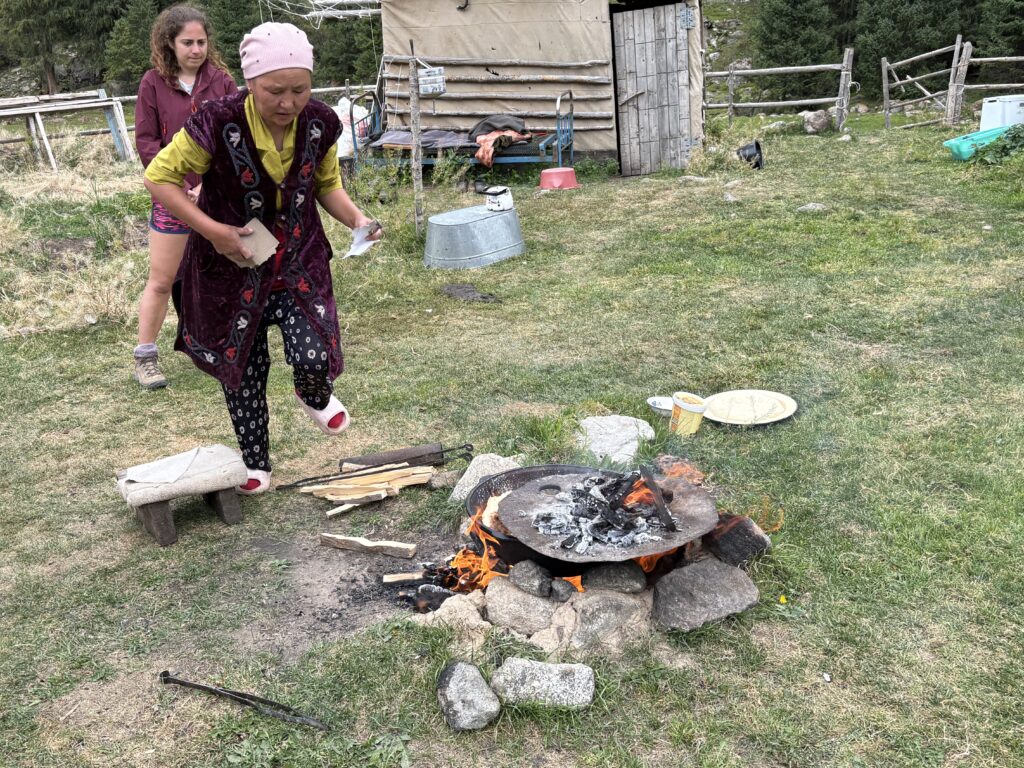 One of the most special experiences during our trip was an opportunity to visit a family spending their summer on the Jailoo. It was a serendipitous moment: they were running late cooking the bread which was meant to be our special surprise, so instead of tearing into it on the road, we got to go and watch it being cooked. We piled into a yurt, drank some kumis (fermented horse milk) and shared delicious fresh bread and homemade jam between us. It’s easy to romanticise a pastoral life when this is your introduction.