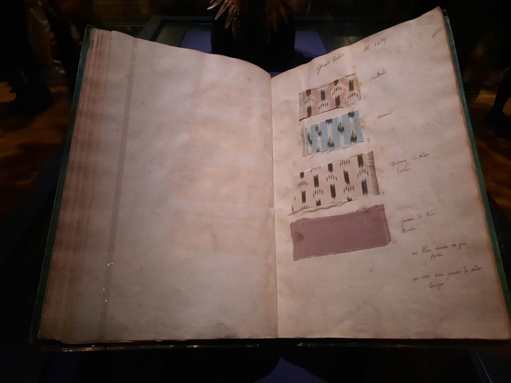 The exhibition opens with a rumination on image. There’s a bust of Marie Antoinette, and an animated portrait. The text talks about her immense influence, and how she became a target for dissenters. Then it’s through into a darkened, Hall of Mirrors-inspired room with sumptuous court fashions. Marie Antoinette’s personal possessions were of course looted and plundered and sold off during the Revolution, but a few scraps remain, including a literal scrapbook of sample fabrics from her gowns. Every time one of her genuine possessions is on view, it’s denoted on the label with a special symbol.