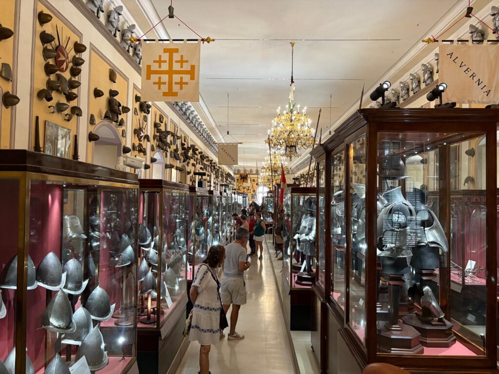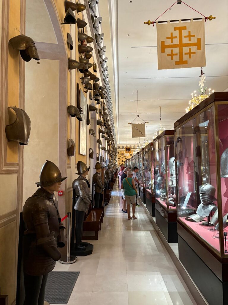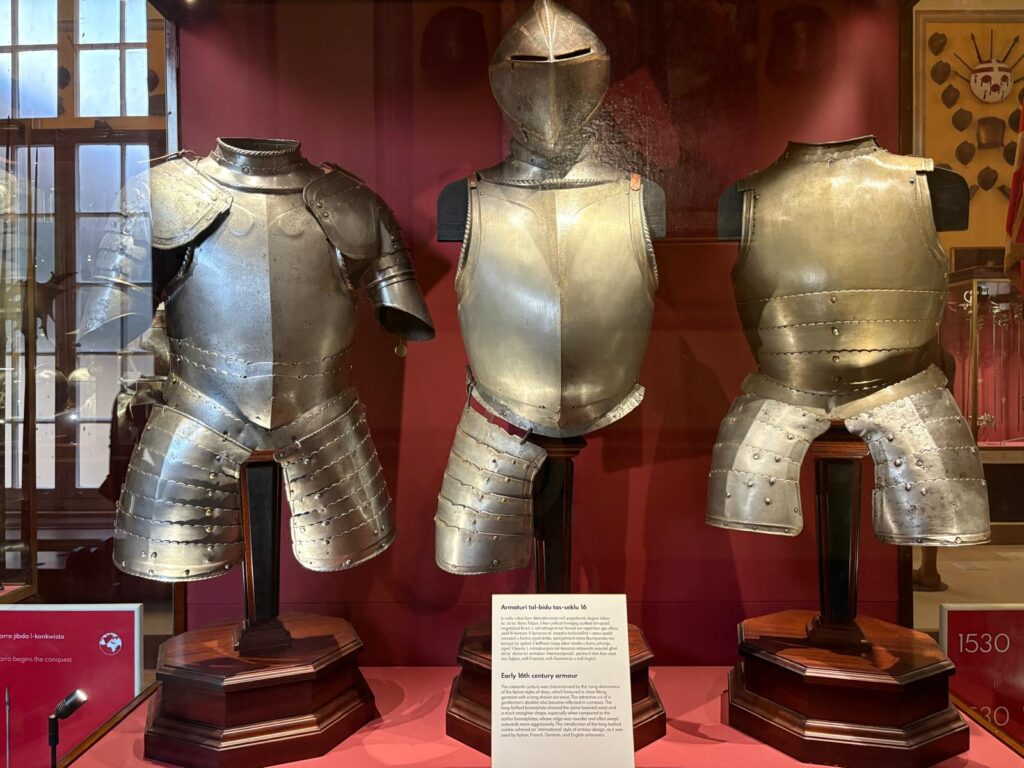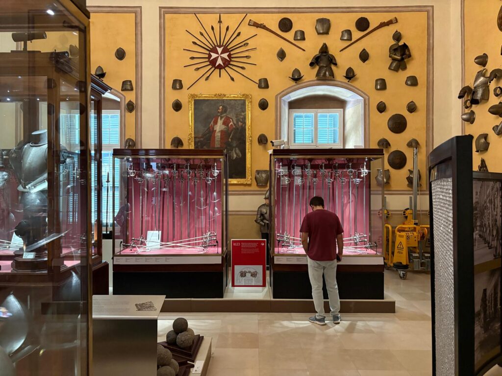 Remember how I said the Armoury was the first part opened to the public, and Malta’s first museum? There’s a reason for that. It’s highly impressive. This is one of the world’s largest collections of arms and armour. It was originally assembled for its intended purpose – the Order’s military defense and ‘defense of Christendom’. But, arrayed in patterns across the walls and in cabinets, it’s also a strangely beautiful sight. There are innumerable suits of armour. Powder flasks, swords, and firearms. If some of the weapons look positively medieval, maybe it’s because they are. There are weapons seized from the Ottoman forces during the Great Siege of Malta, and items belonging to some of the famous Knights Hospitaller through the centuries. What a proclamation of power.