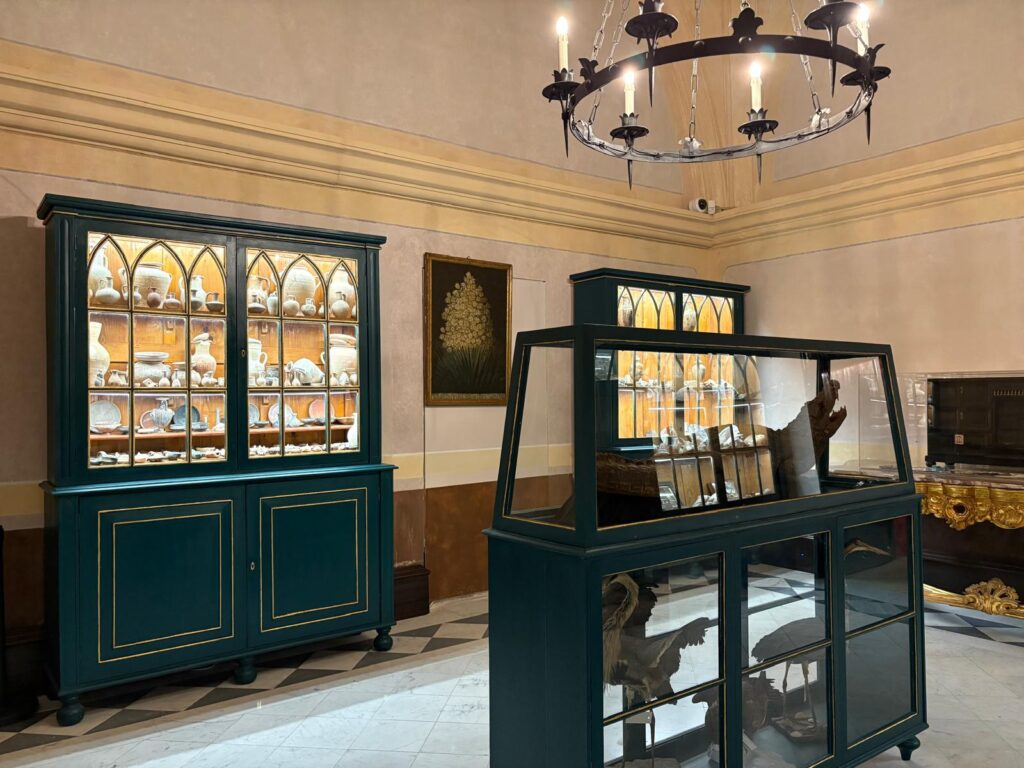 Coming from the Armoury, I was a bit less enthused about the state rooms. Or maybe I’m just lucky to have seen a few palaces in my time, and have become spoiled. That’s definitely a possibility, because the state rooms, objectively, are impressive. Many have friezes of paintings running around the top of the walls, highly decorated ceilings, and sumptuous colours. There are historic paintings, and unique objects like a French crest from their short time here in Malta. Some of the smaller-scale displays are interesting, too. I liked, for instance, a room that had a small cabinet of curiousity-style display of antiquities and natural history specimens (including an alligator or crocodile). A reminder that princely pursuits seem to appeal whether one is born a prince, or becomes one by election.