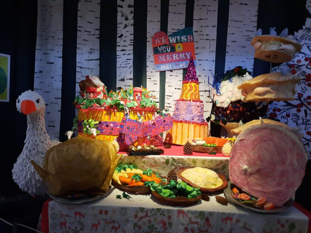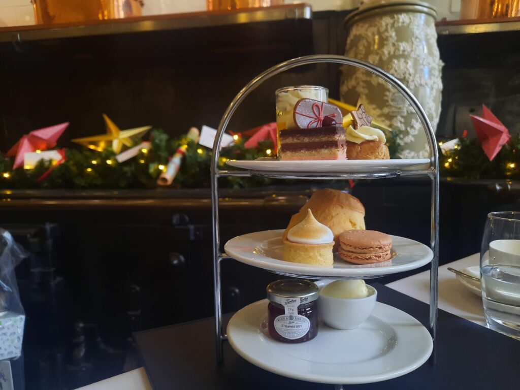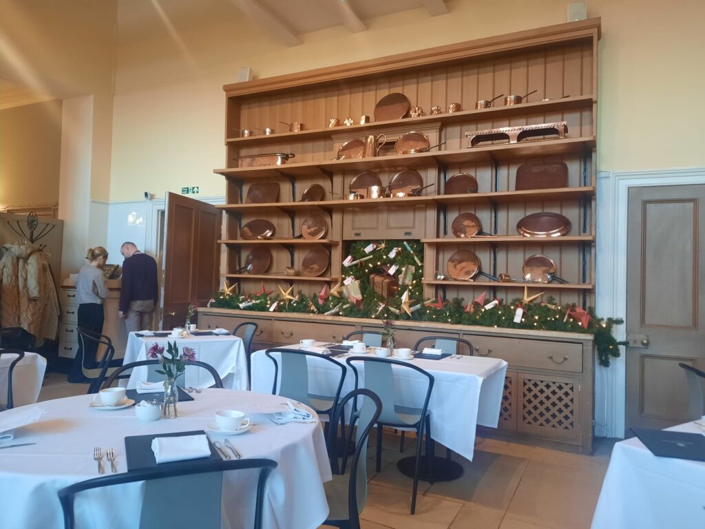 Nonetheless, Waddesdon Manor well and truly gives itself over to Christmas. We started, after a small detour to meet some huskies from a local charity, in the stables. Here there is a Santa letter-writing station, and a very impressive multi-sensory exhibition Sounds of the Season, where local school children have contributed to stations representing different Christmas songs. From there we walked up, via a Christmas shop, towards the main house. We wandered the Christmas market and food stalls: this has been a seasonal staple at Waddesdon for decades. After a bit more walking around the grounds it was time for our afternoon tea. The menu was classic rather than festive, but the kitchens were nicely decked out for Christmas.