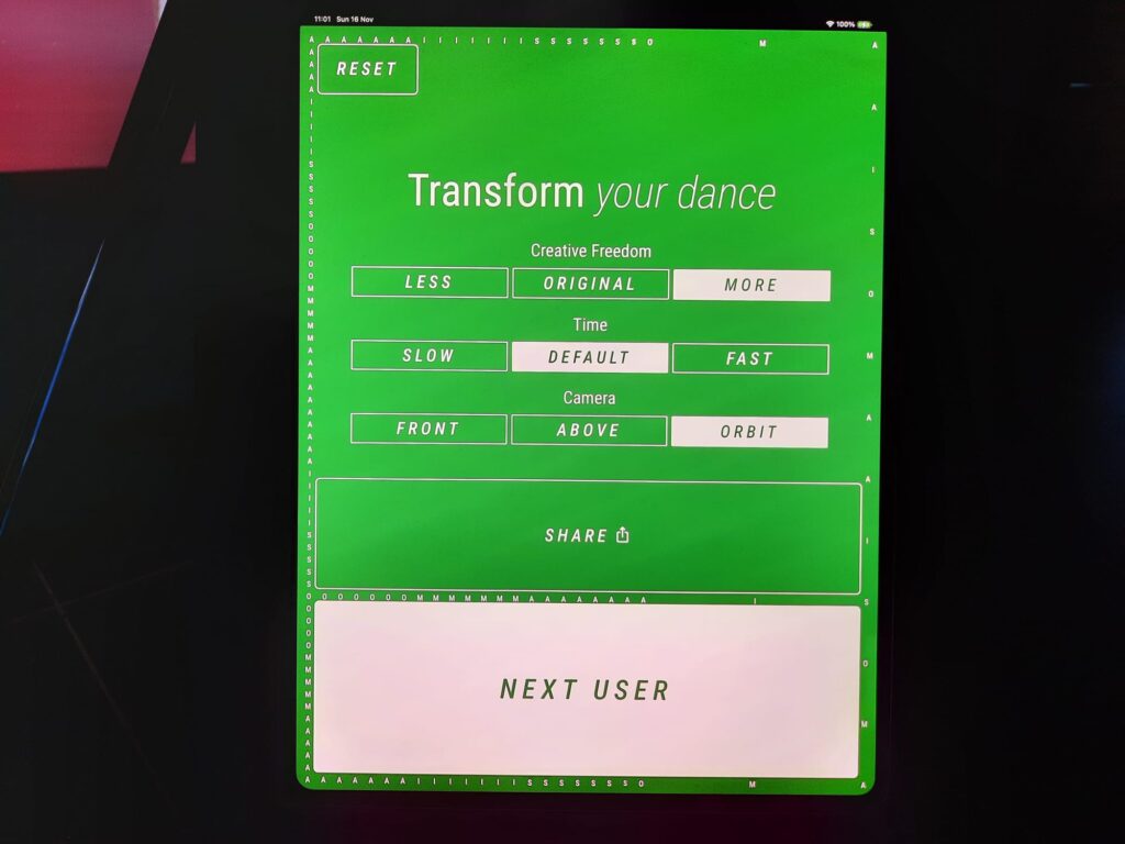 AISOMA, a machine-learning choreography tool, is a good example. You give the system an eight-second dance reference and it offers variations based on McGregorโs movement vocabulary. On paper that sounds a bit embarrassing, but in practice it was great fun. Especially on a quiet Sunday morning when I more or less had the room to myself. I tried a sequence, then pushed and pulled it via the different parameters, and saw how the system exaggerated my choices. It felt intelligent, rather than just playing with random dials for effect.