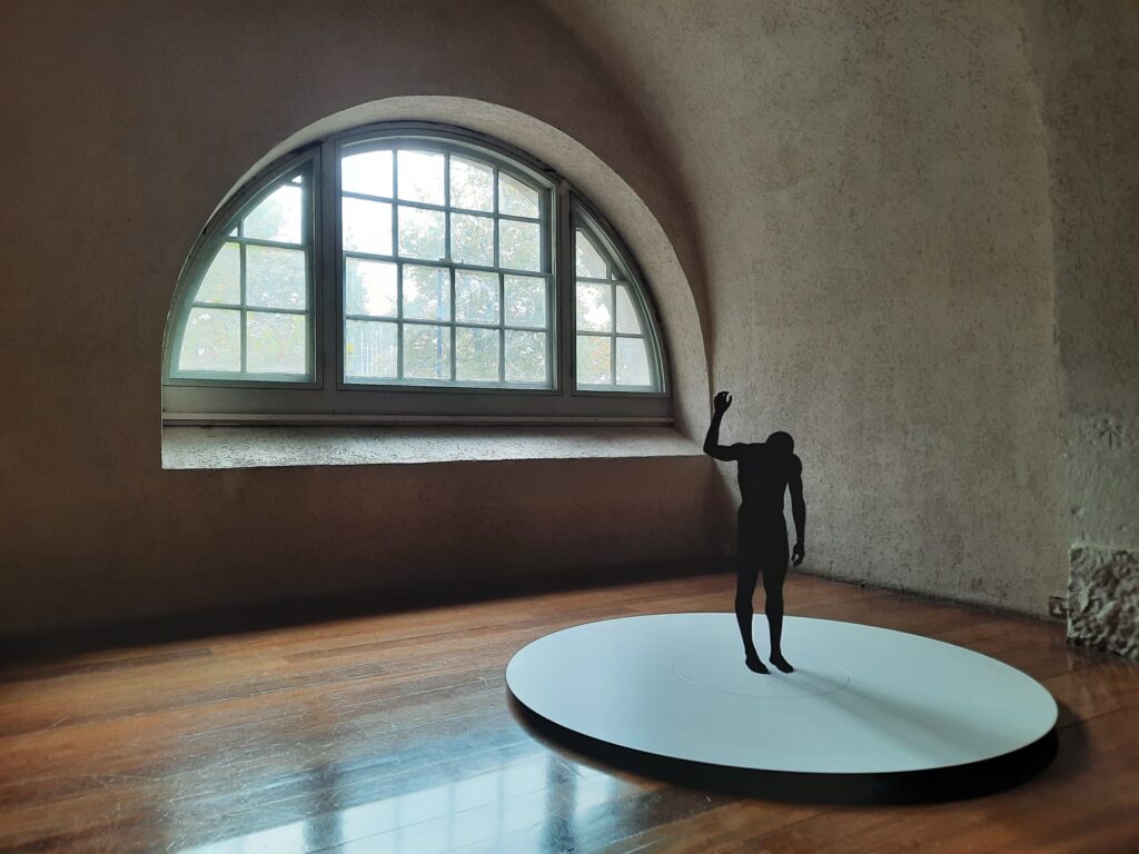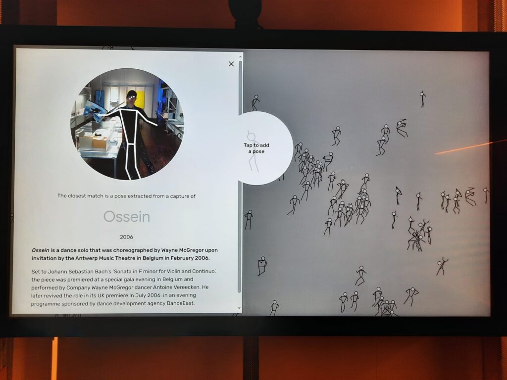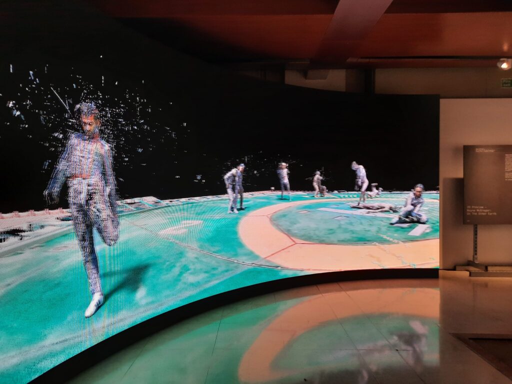 Infinite Bodies consists of a number of technology-forward exhibits, many interactive, and many collaborative, as well as a sort of workroom which gives insights into McGregor’s process. What struck me most, and what sets this apart from a lot of creative-AI exhibitions, is how McGregorโs approach is genuinely human-centred. Not in the way companies will tell you they’re implementing AI ethically, but in the way the installations only really come alive when youโre physically in them. Thereโs no sense of โtechnology replacing the artist.โ Instead, this is a genuine example of ‘human in the loop‘. It feels like a conversation between you, the McGregor archive, and the systems heโs developed and collaborated on over the years.