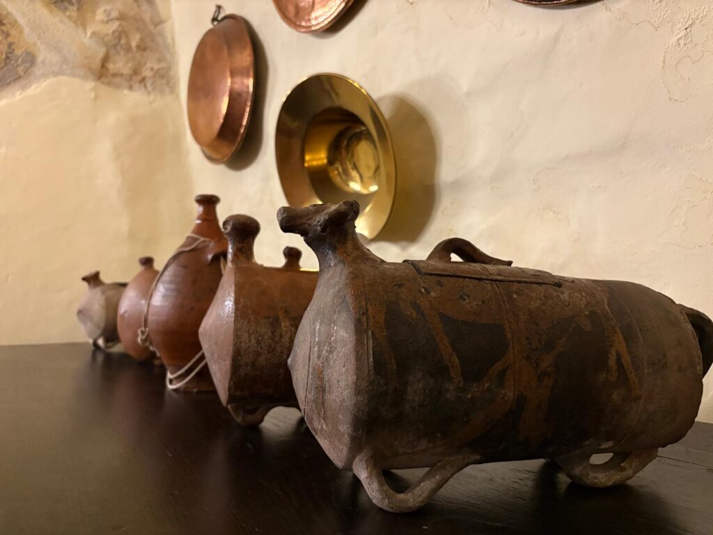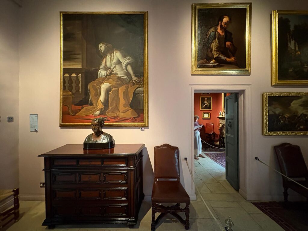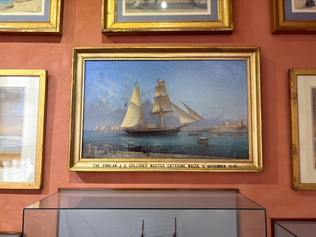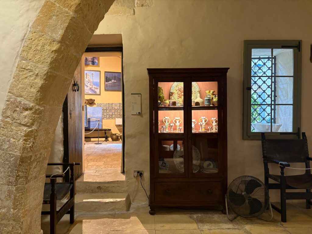 The seventeen rooms balance form and function, presenting grouped objects to tell a tale of Maltese history while also respecting the narrative about Gollcher’s time living here and building his collection. Visitors meet some real curiosities early on, including a purported chastity belt. This is part of a ground floor room otherwise housing arms and armour. Nearby, the kitchen is the main event on this level. It still has echoes of being a busy working kitchen, while displaying painted tiles, and examples of il-baqra, an animal-shaped vessel used to cook rabbit stew and affectionately known as a ‘cow’. There is also an artist’s studio: Gollcher was a painter as well as collector.