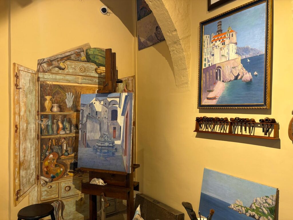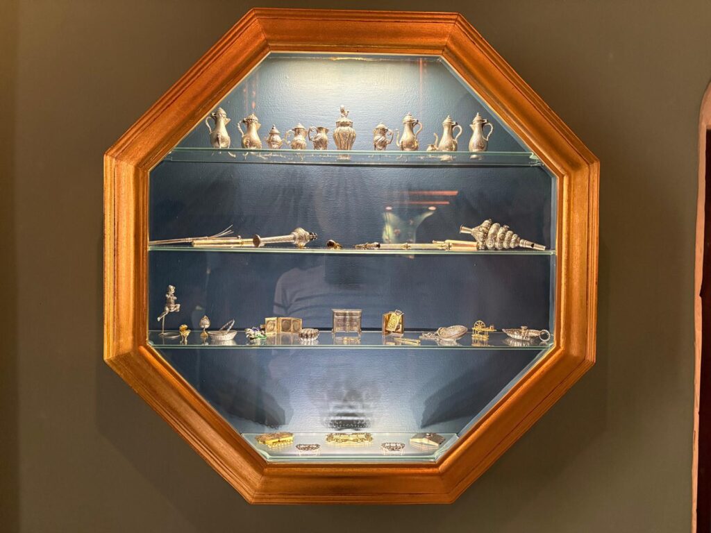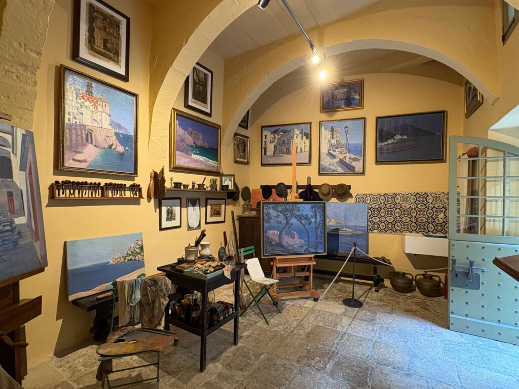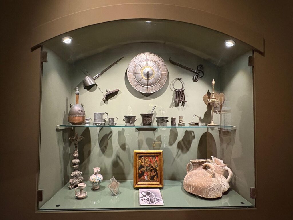 The seventeen rooms balance form and function, presenting grouped objects to tell a tale of Maltese history while also respecting the narrative about Gollcher’s time living here and building his collection. Visitors meet some real curiosities early on, including a purported chastity belt. This is part of a ground floor room otherwise housing arms and armour. Nearby, the kitchen is the main event on this level. It still has echoes of being a busy working kitchen, while displaying painted tiles, and examples of il-baqra, an animal-shaped vessel used to cook rabbit stew and affectionately known as a ‘cow’. There is also an artist’s studio: Gollcher was a painter as well as collector.
