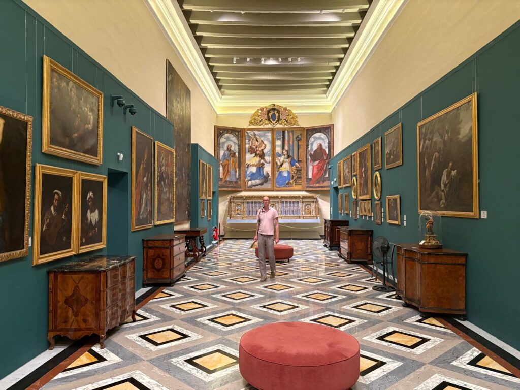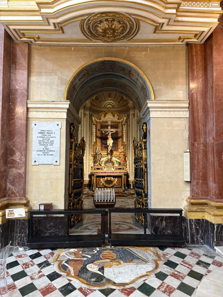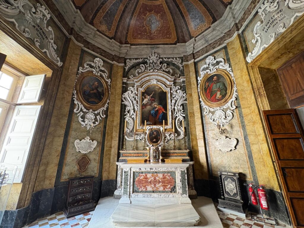 I also enjoyed the more decorative of the rooms. By this point in my journey around Malta I was rather getting into Baroque architecture and decoration. Not normally my favourite period, but definitely impressive when done well. And Malta does it well. Some rooms are fairly modest, having started life as dormitories or the like. Others are high Baroque, particularly the chapel. With an octagonal layout, the chapel features paintings by Antoine Favray. It also has a trompe-l’oeil fake dome ceiling. Having missed the one in Victoria, Gozo, I was pleased to have an opportunity to admire another fake dome here. Bishop Alpheran de Bussan, who commissioned the decoration of the chapel, loved it so much that he had his heart buried here.