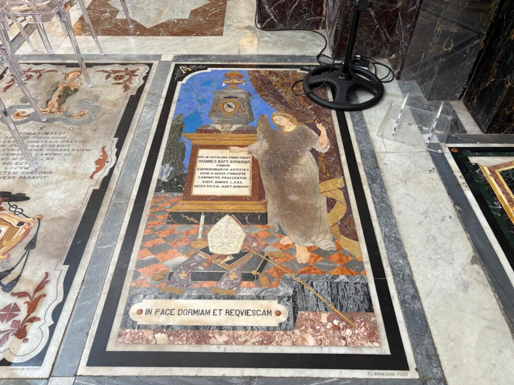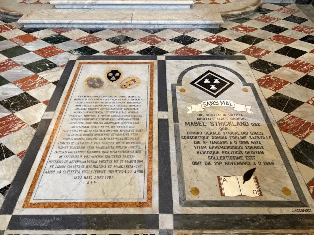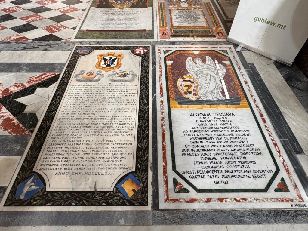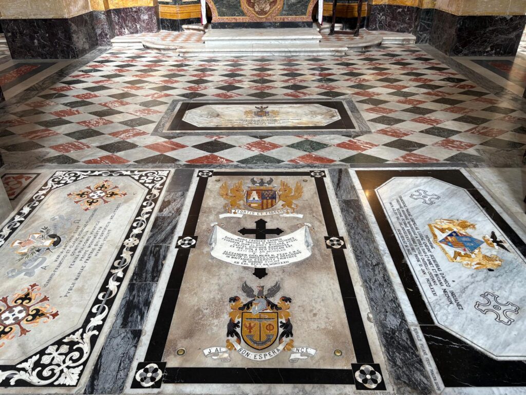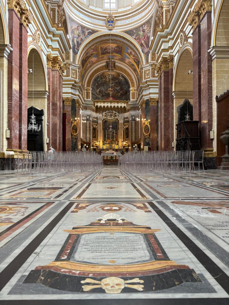 As I was saying above, St Paul’s Cathedral is in the Baroque style. It also has some influences from Maltese architecture. Its main façade is on St Paul’s Square, with two bell towers originally containing six bells. It has an octagonal dome. With the most important Maltese churches, however, it’s not the exterior but the interior that makes the biggest impression. Like St John’s Co-Cathedral (and apparently also the Cathedral of the Assumption in Gozo, which I didn’t visit), the floor of St Paul’s Cathedral consists of tombstones in inlaid marble. They are highly decorative, and very impressive. You can see a few examples in the images above, with common motifs including skulls or skeletons, angels, family crests, and hints at professions, such as bishops’ hats.