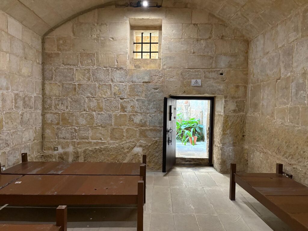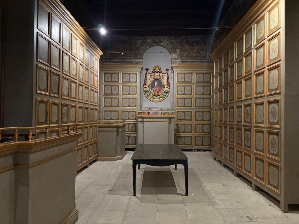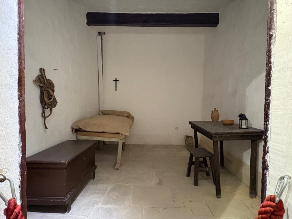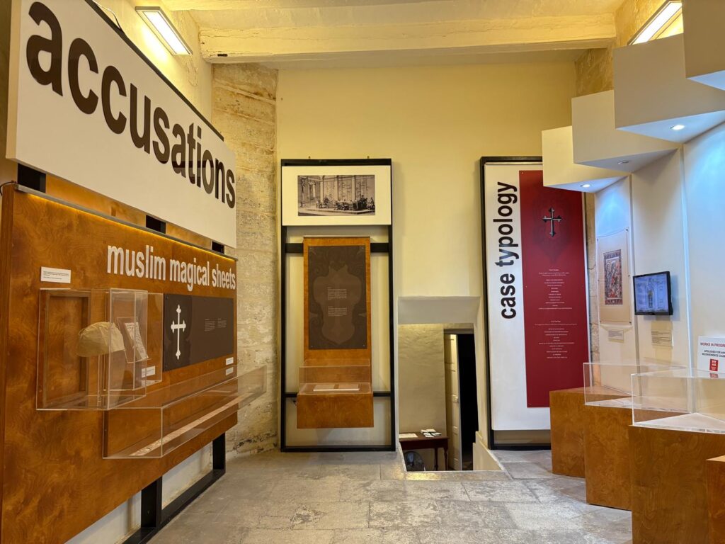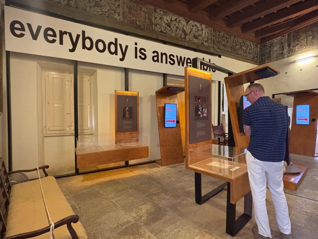 There are some other sections still to go. Within the section on tribunals there is a temporary exhibition space. When I visited, it hosted The Ship (Unseen) by Matthew Attard, a continuation of Malta’s 2024 pavilion at the Venice Biennale. I found it a little incongruous, but not as much as a display of hats in another temporary exhibition space elsewhere. To finish with, visitors pass through the palace’s prison cells. By this time you’ve seen a video on torture methods, so can imagine the misery of the inmates. And with that, we headed back to the exit and out into the sunshine, glad not to have run into the Inquisition itself.