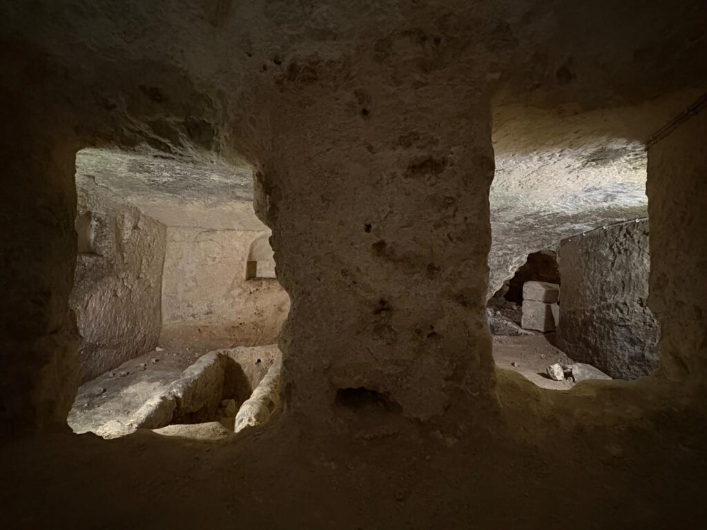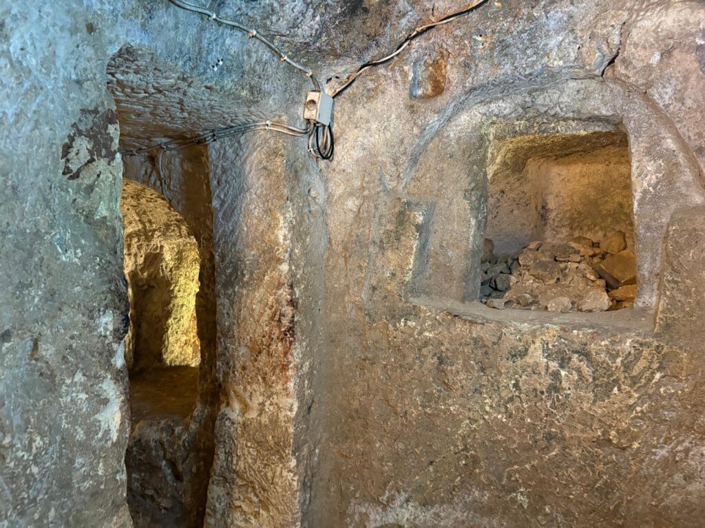 We then went back down the stairs, retraced our steps, and proceeded to the catacombs and tunnels. Malta has a lot of underground spaces to visit. In Rabat alone, as well as the Wignacourt Museum, there are St Paul’s Catacombs and St Agatha’s Catacombs. The space in the Wignacourt Museum tells a couple of very different stories. The older parts are Punic, Roman and early Christian burial spaces, or hypogea. Underground burial was common in Malta from Neolithic times, even though there was no continuity in population or belief system between those early inhabitants and the builders of the spaces we’re now visiting. There are a lot of tunnels and chambers to see, as well as one or two ritual spaces.