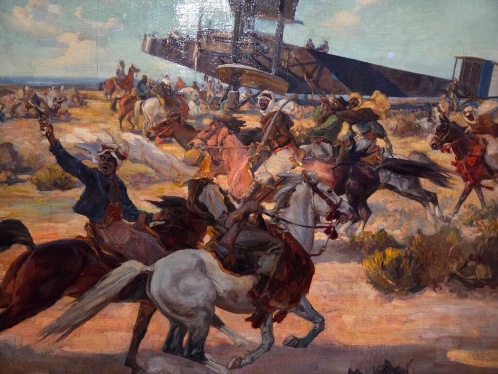 The next space dismantles the more heroic imagery traditionally associated with empire. The room resembles an office, complete with desk, chair and framed artworks. Portraits of imperial figures such as T. E. Lawrence and Lord Kitchener hang on the walls. Another painting showing mounted troops in Palestine alongside a modern (1918) bomber. Together, the displays begin to question the myth of imperial heroism and reveal the racial hierarchies that underpinned colonial rule.