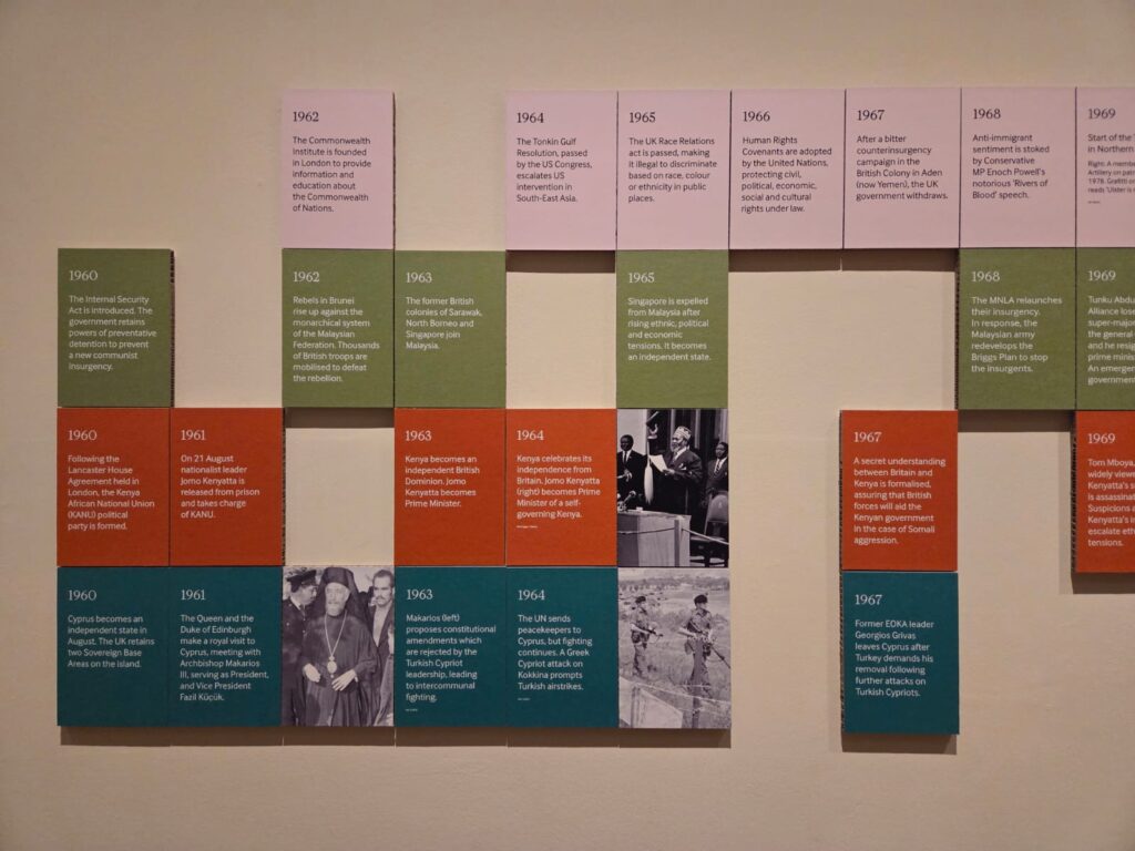 A timeline running along one wall places events in Britain alongside those in Malaysia, Kenya and Cyprus. It makes clear that independence did not neatly resolve the tensions created during the colonial period. Malaysia soon faced its own internal fracture when Singapore was expelled in 1965. Cyprus remains divided following conflict between Greek and Turkish communities. Meanwhile in Britain, immigration from former colonies became an increasingly charged political issue, represented here by events including Enoch Powellโ€™s infamous 1968 โ€œRivers of Bloodโ€ speech.