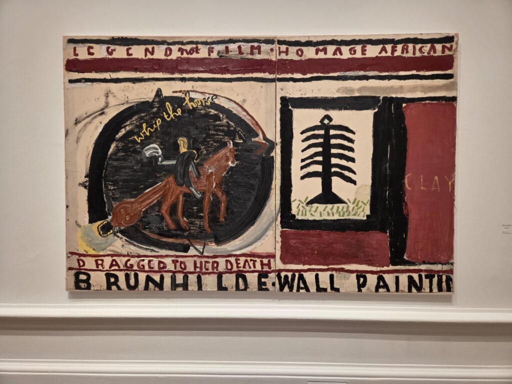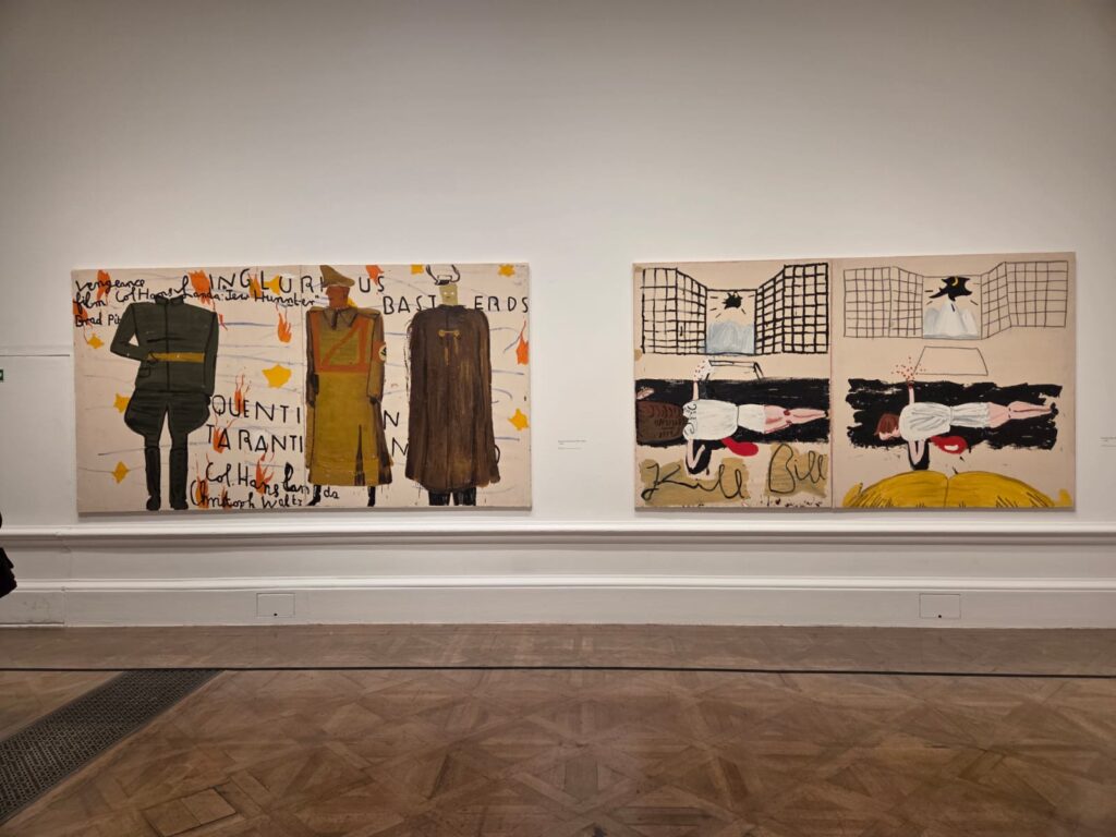 Subsequent galleries continue to be arranged mostly by series. Often, what distinguishes them seems to be their inspiration, more than differences in their style. Although there are stylistic differences, too – particularly sparser and denser compositions. Wylie is something of a magpie, finding subjects for her paintings in newspapers, films, diaries, and other sources. It brings to mind Francis Bacon: Man and Beast, which I saw in these same galleries. You don’t need detective work to find Wylie’s sources, however. She often writes them directly onto the canvas, such as the paintings depicting scenes from Inglourious Basterds or Syriana. The films in this series are somehow recognisible yet distinctly Wylie’s.