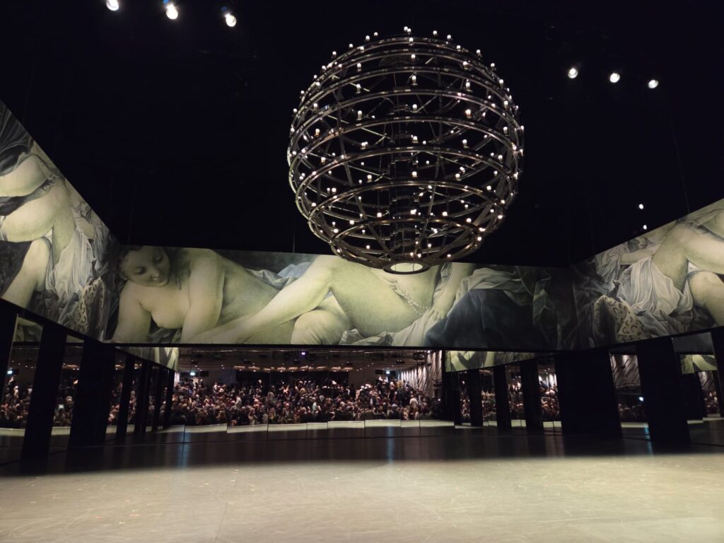 The design very cleverly reflects this idea of a game which is actually a blood sport. Rosanna Vize‘s set is surrounded on three sides by mirrors, with sensual Rococo art hanging above. Servants (costume design by Natalie Roar) wear black mesh over their heads. For the characters they are merely furniture, until they enter the action by betraying their master or mistress. Movement sequences by Tom Jackson Greaves (which I like although they undoubtedly contribute to the running time) further the notion of sex as weapon, game, pleasure, pain and – if you’re unlucky – love.